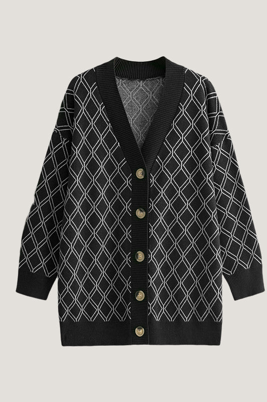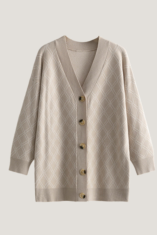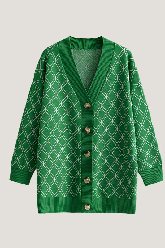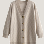 Knitted cardigan,V-neck long-sleeve loose fit,front placket buttons unbuttonable,body fully covered with argyle patterns |