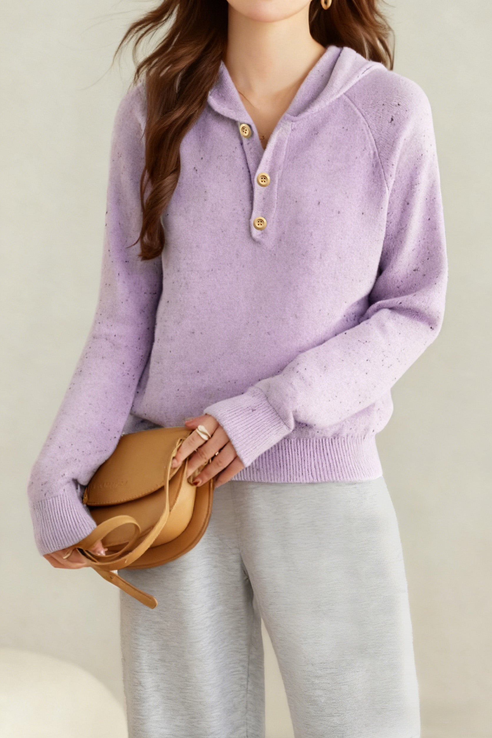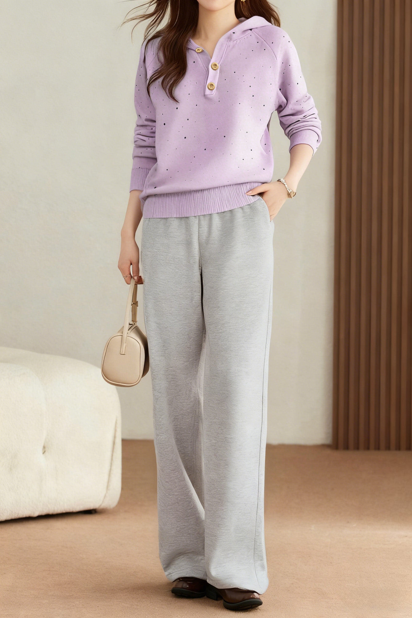 2-Piece set,the top is pullover hooded long-sleeve loose fit,neckline with unbuttonable buttons,pants waist with adjustable drawstring,side pockets on both sides |