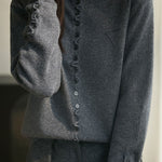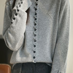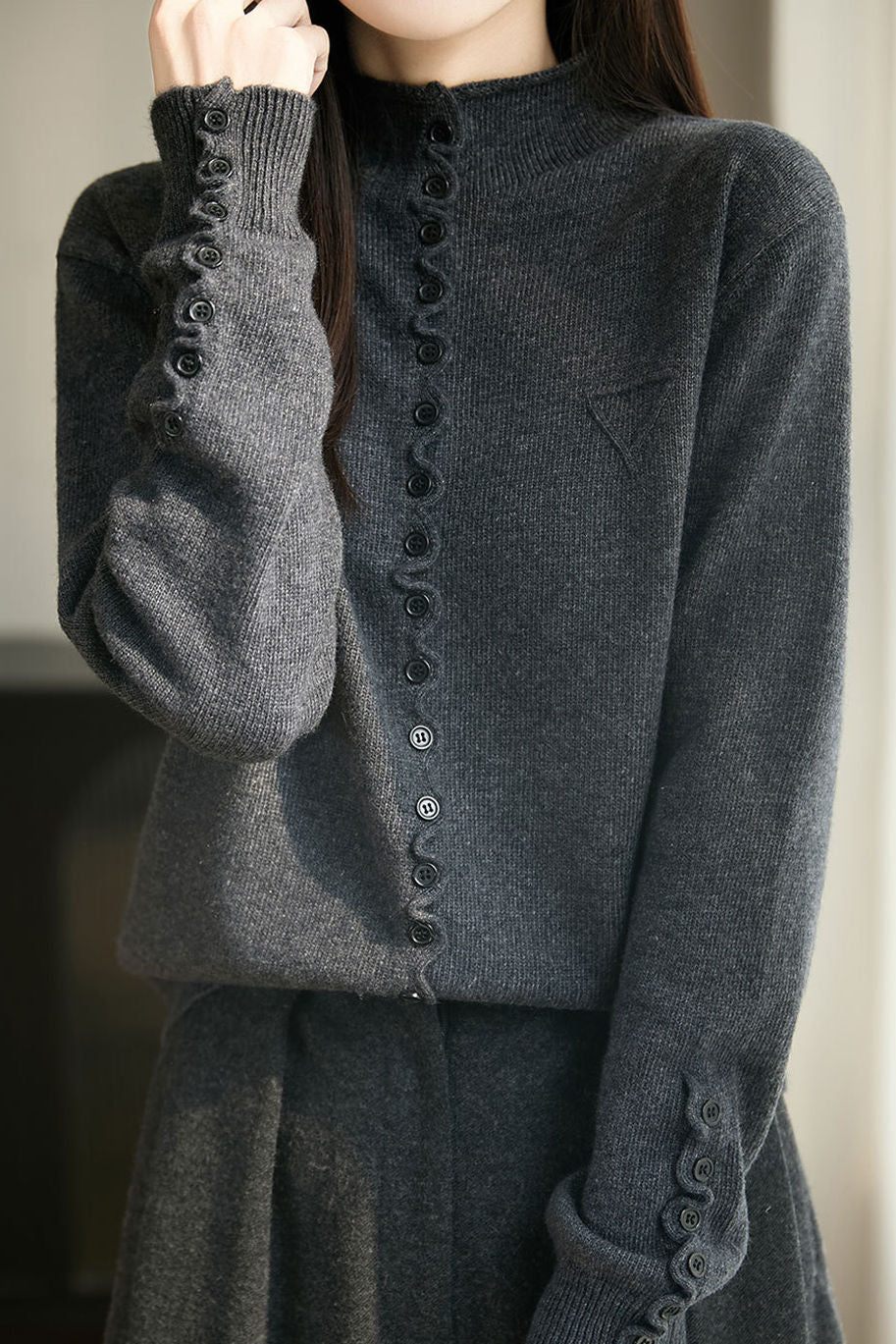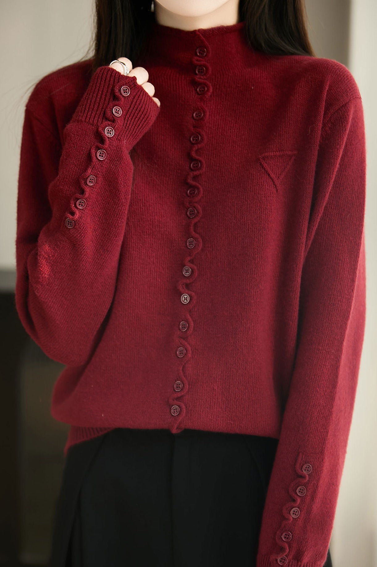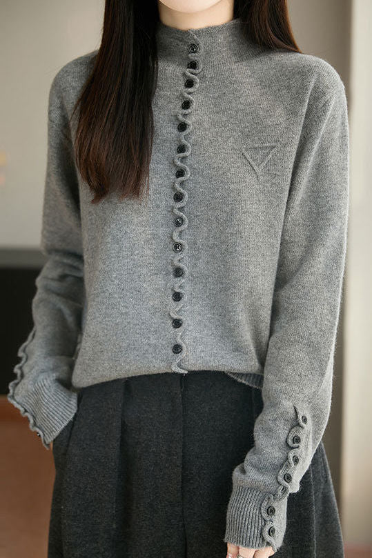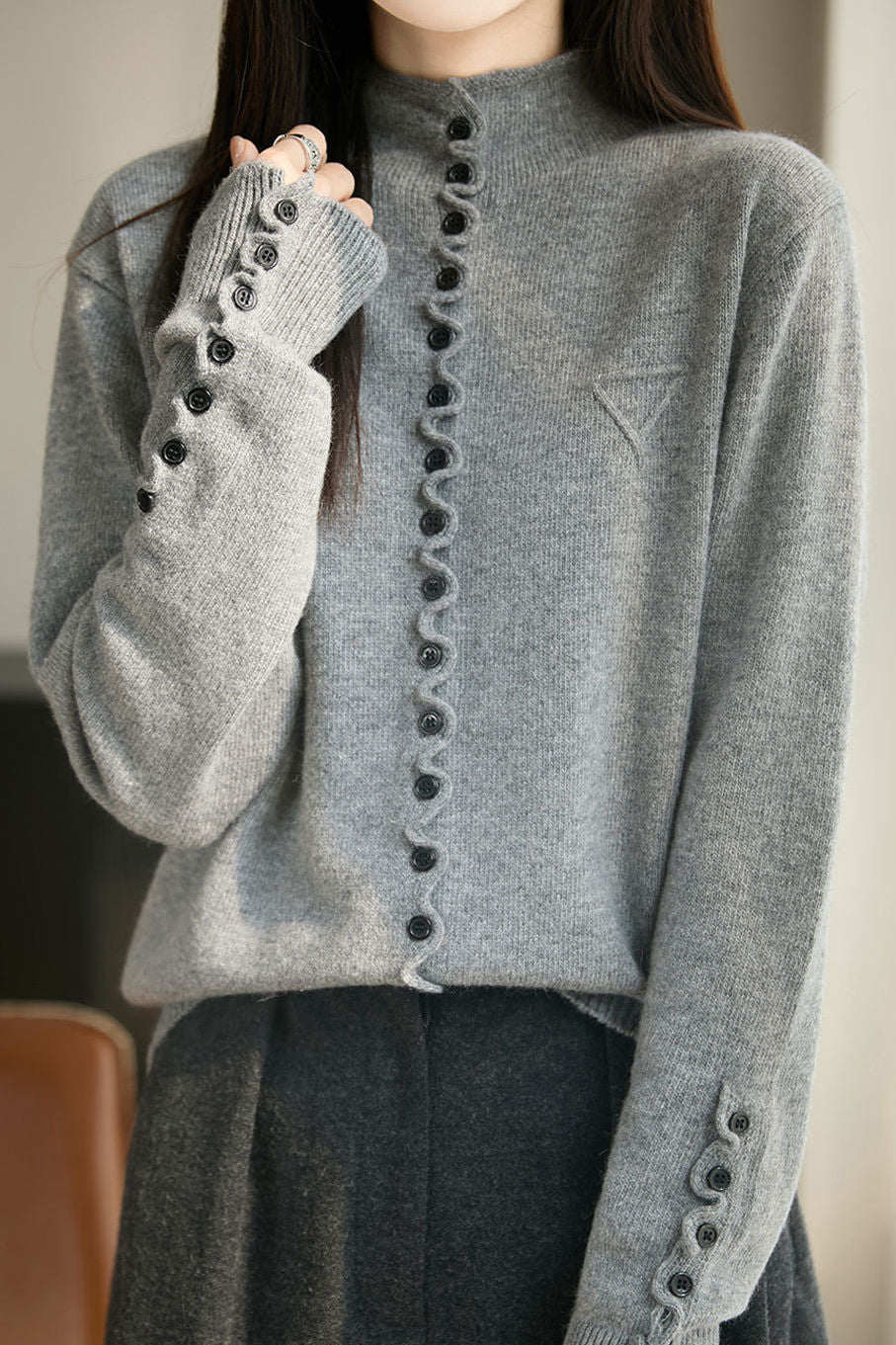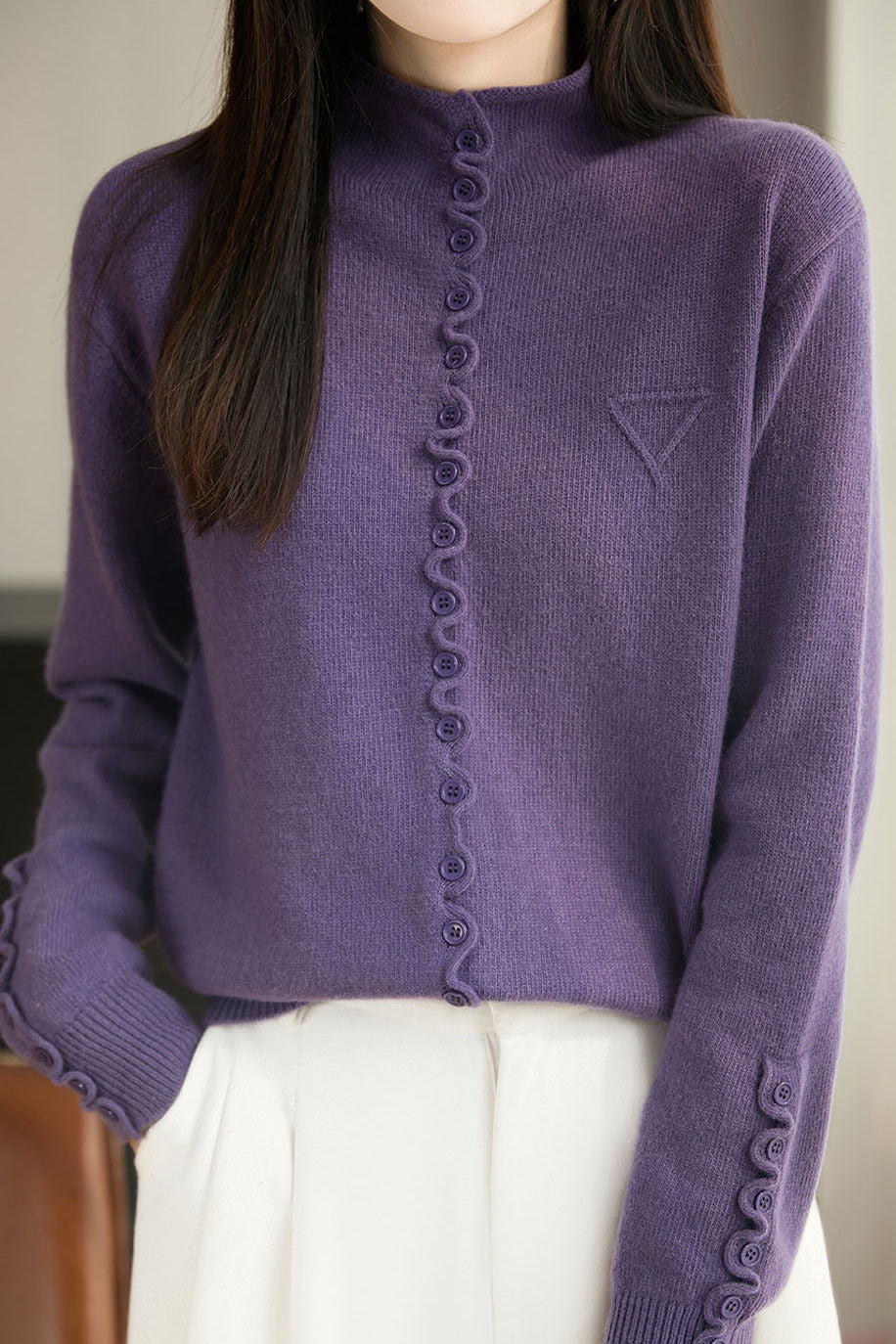 Knitted cardigan,pullover half-high neck long-sleeve loose fit,front placket buttons and cuff buttons unbuttonable,chest with same-color triangular decoration |