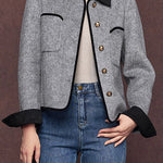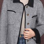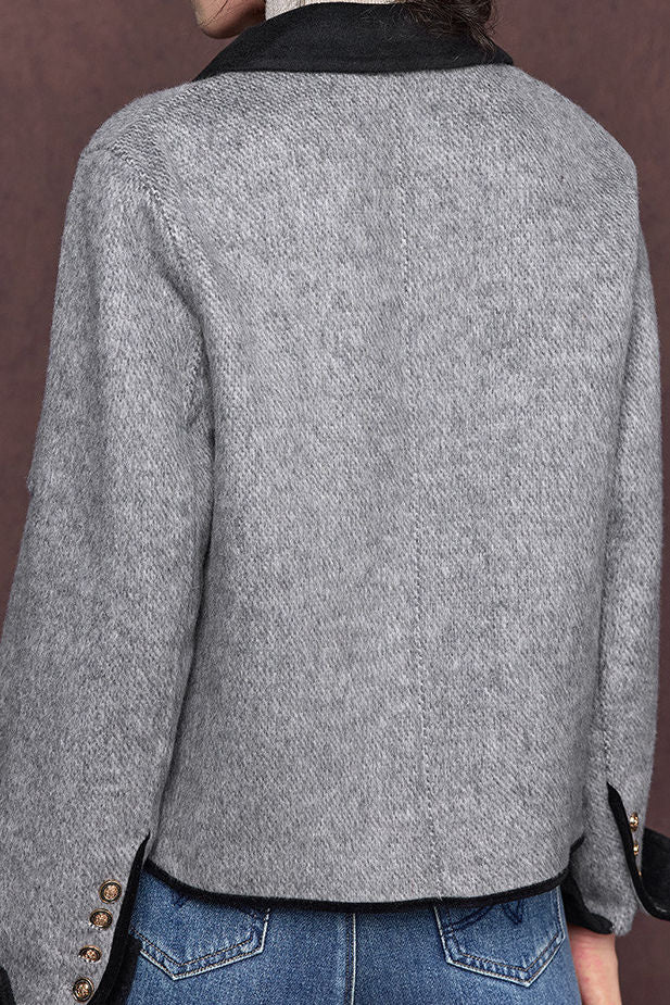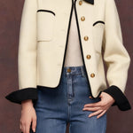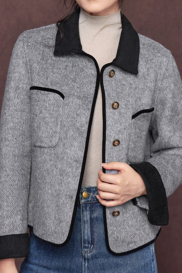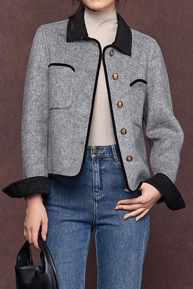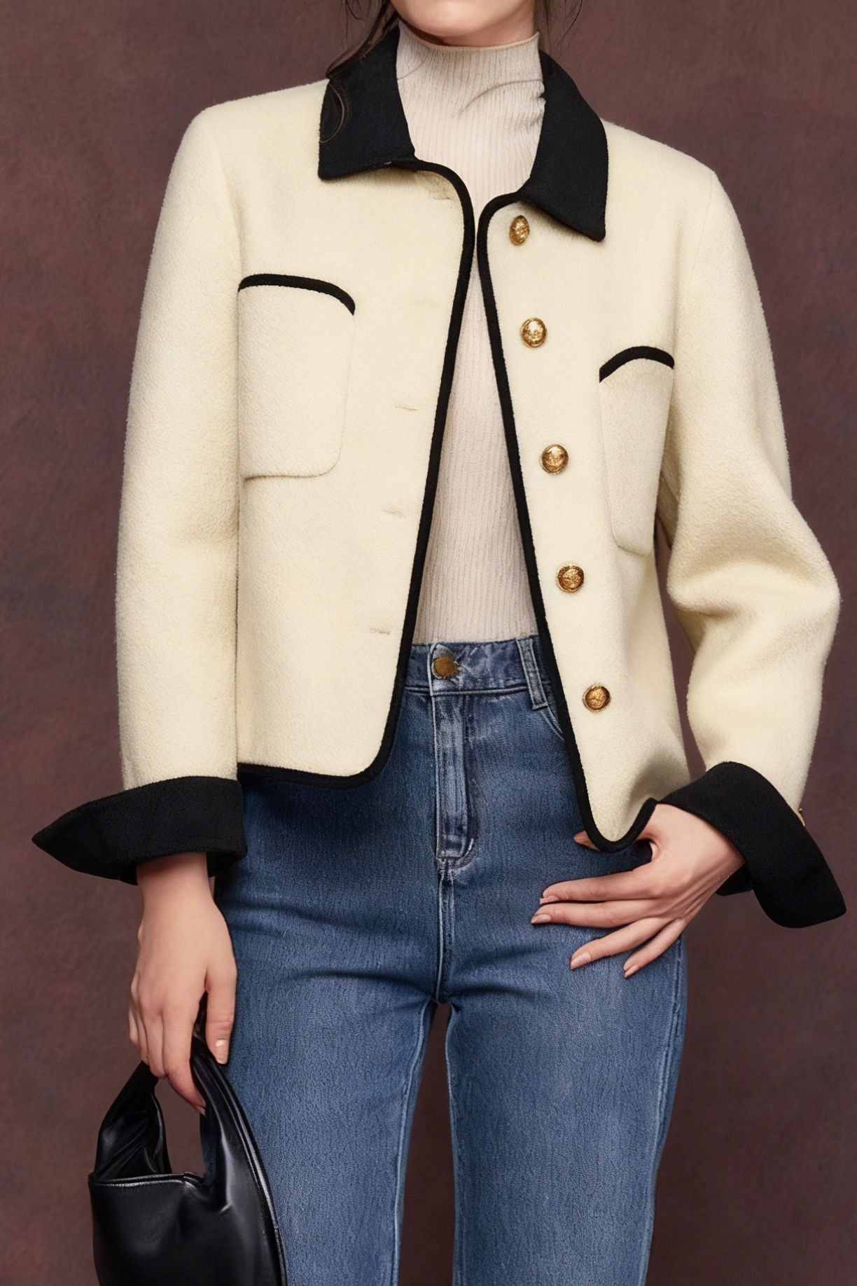 Coat,lapel long-sleeve loose fit,front center with openable buttons,chest with patch pockets,binding, placket,collar and cuffs form color-block design with the body |