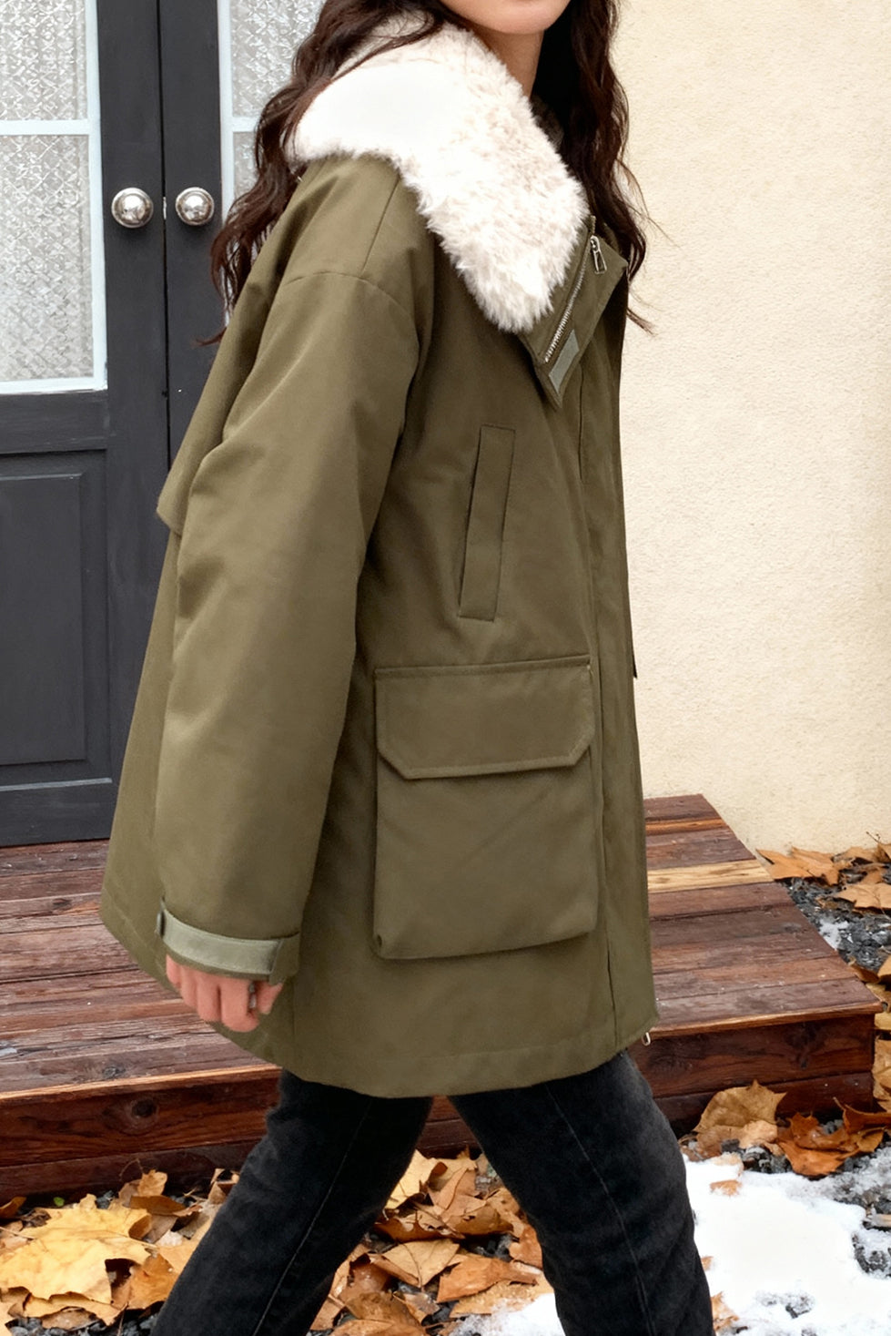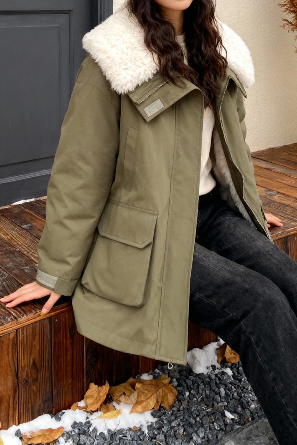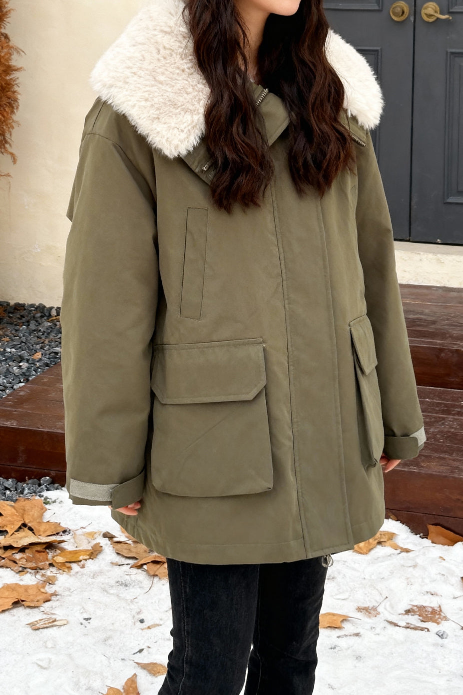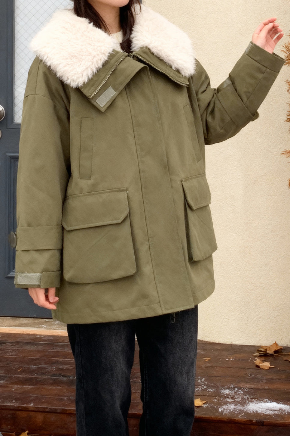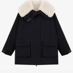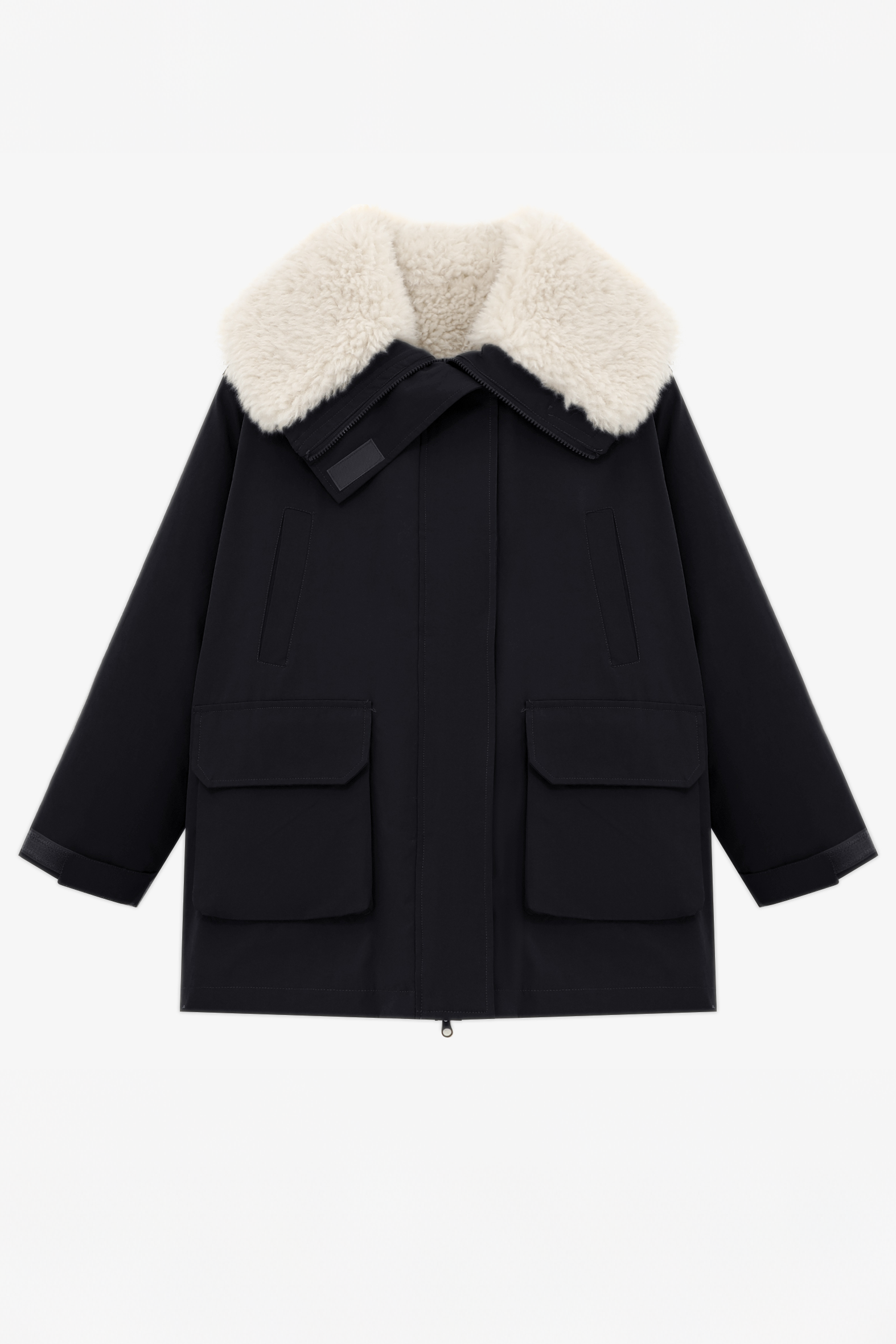 Cotton-padded coat,lapel long-sleeve long fit,collar circumference and lining with sherpa fabric for warmth,front center with openable placket,patch pockets and velcro pocket loops on both sides,back yoke structure design at the back center |