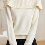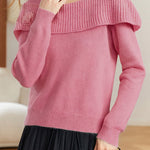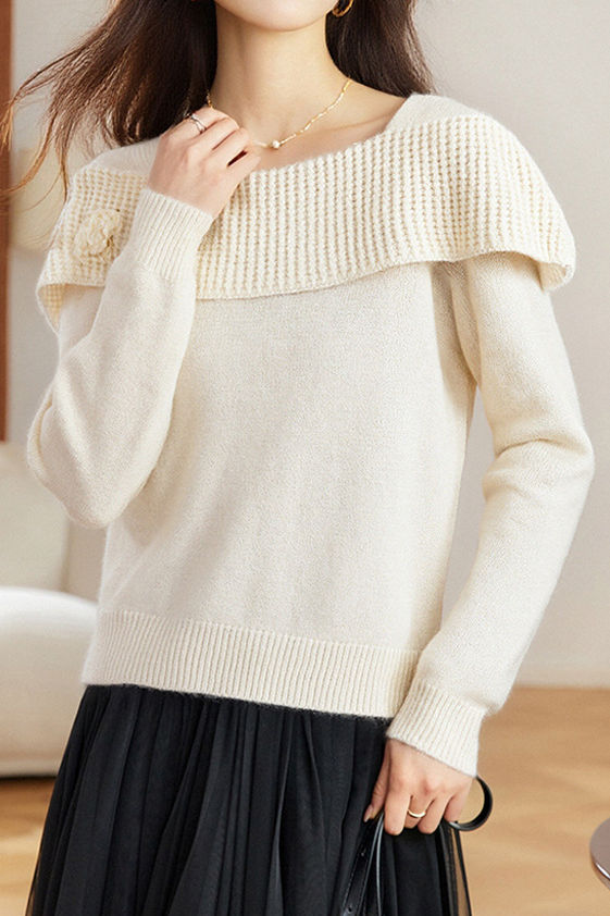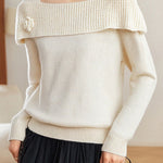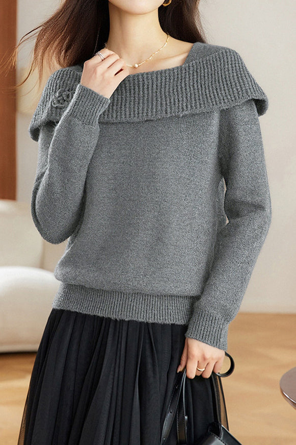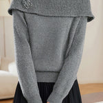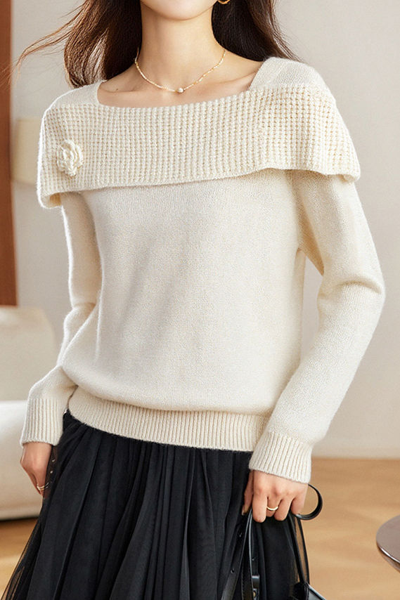 Knitted top, off-the-shoulder long-sleeve loose fit, thick-knitted off-the-shoulder detail on chest and shoulders, three-dimensional crocheted flower design on left chest |