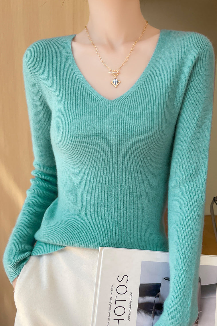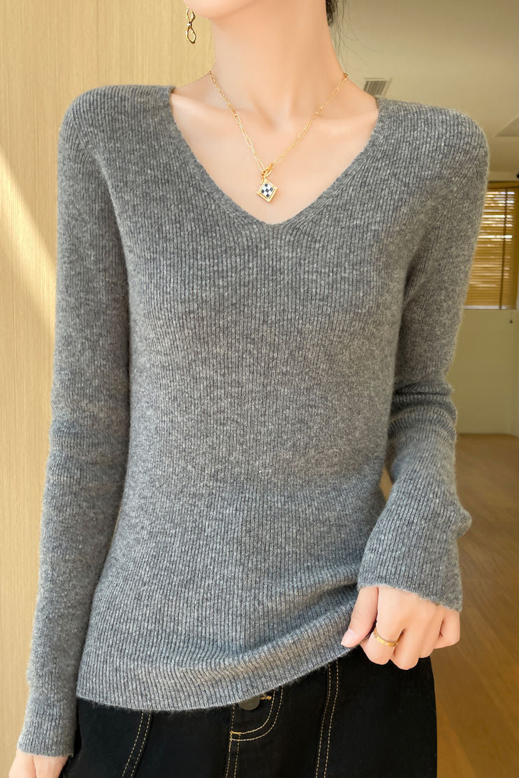 Knitted top, pullover v-neck long-sleeve slim fit, solid color, body with ribbed texture design |