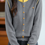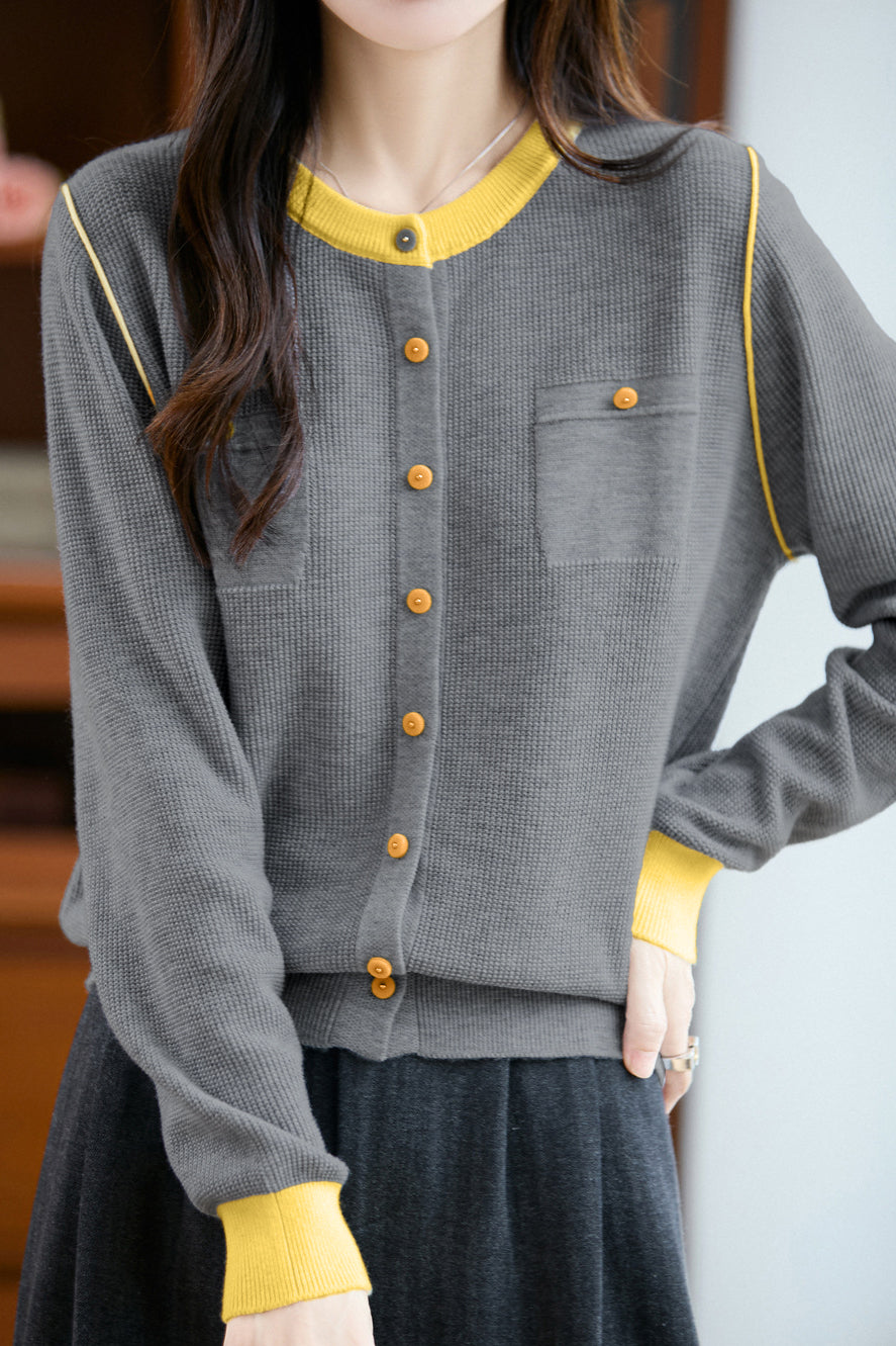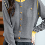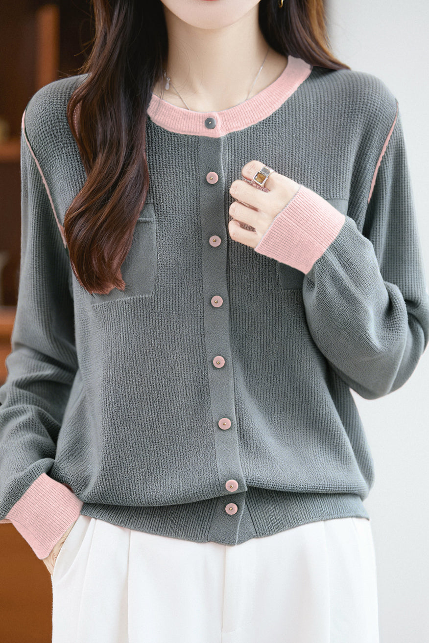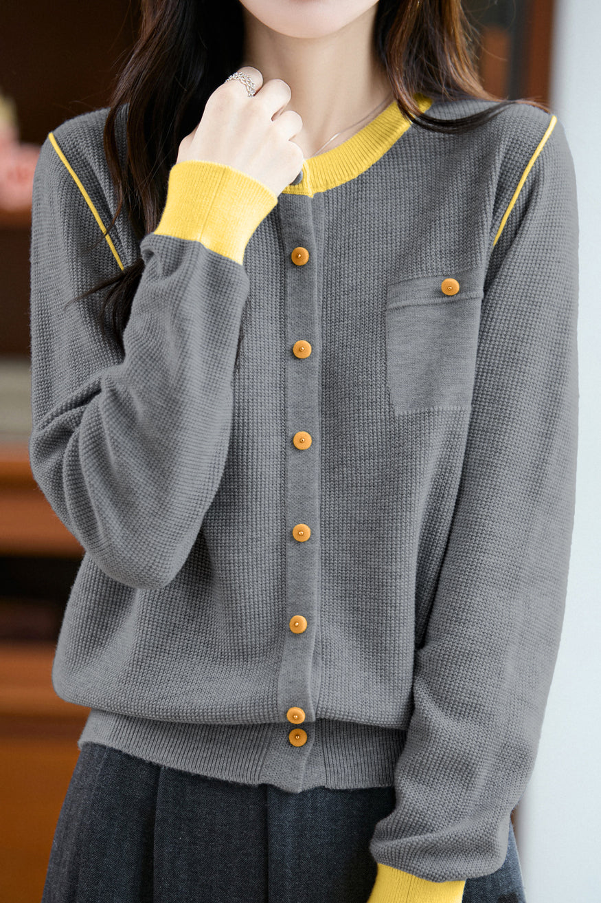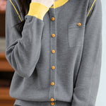 Cardigan, crew neck placket design, neatly arranged buttons, neckline and cuffs with color-block paneling, patch pockets added for design sense, soft and skin-friendly knitted fabric, loose and comfortable fit |