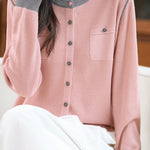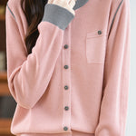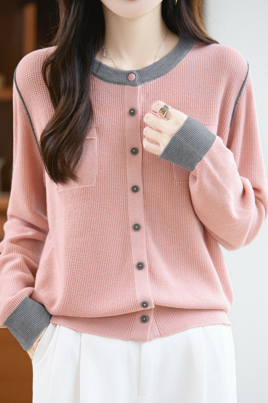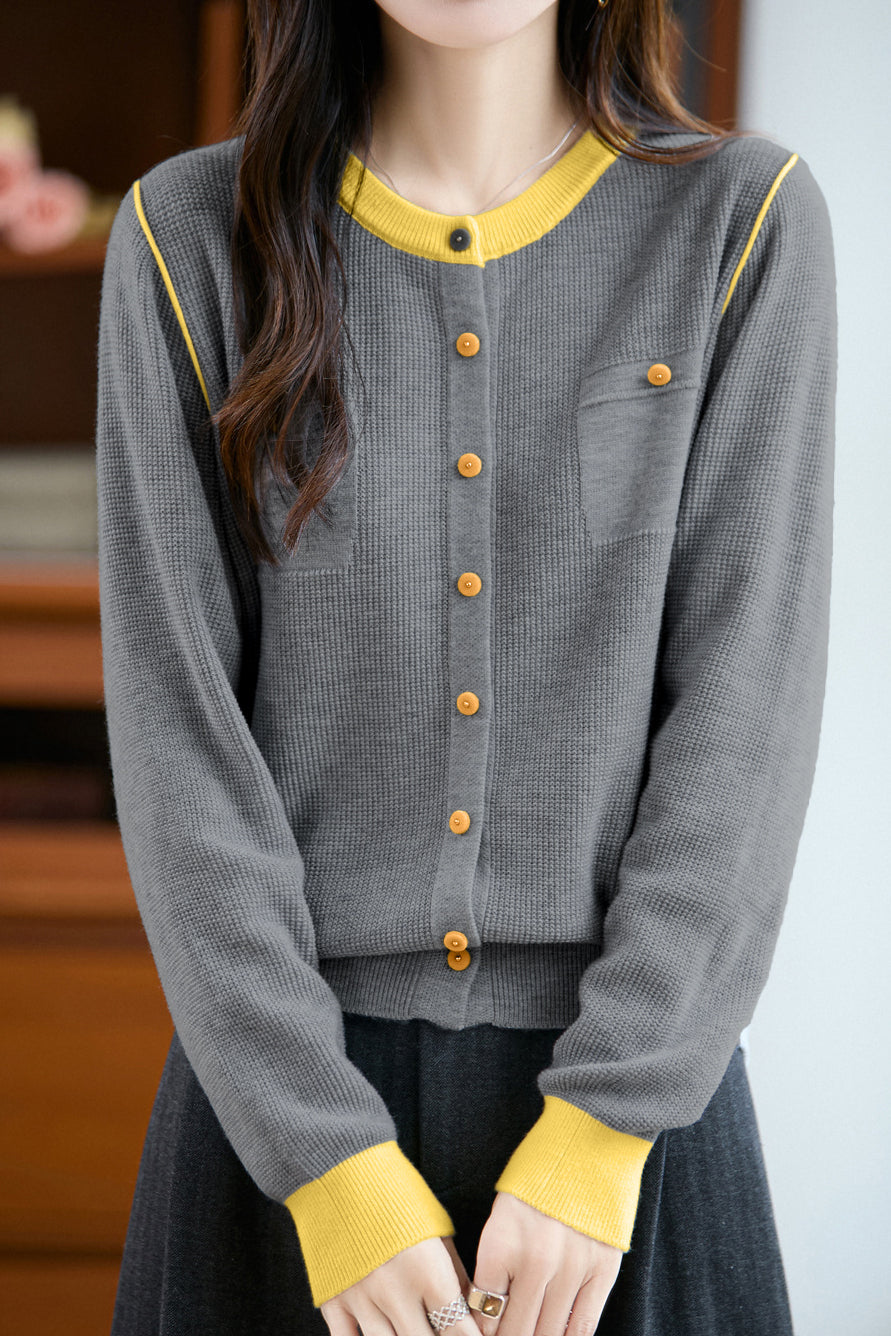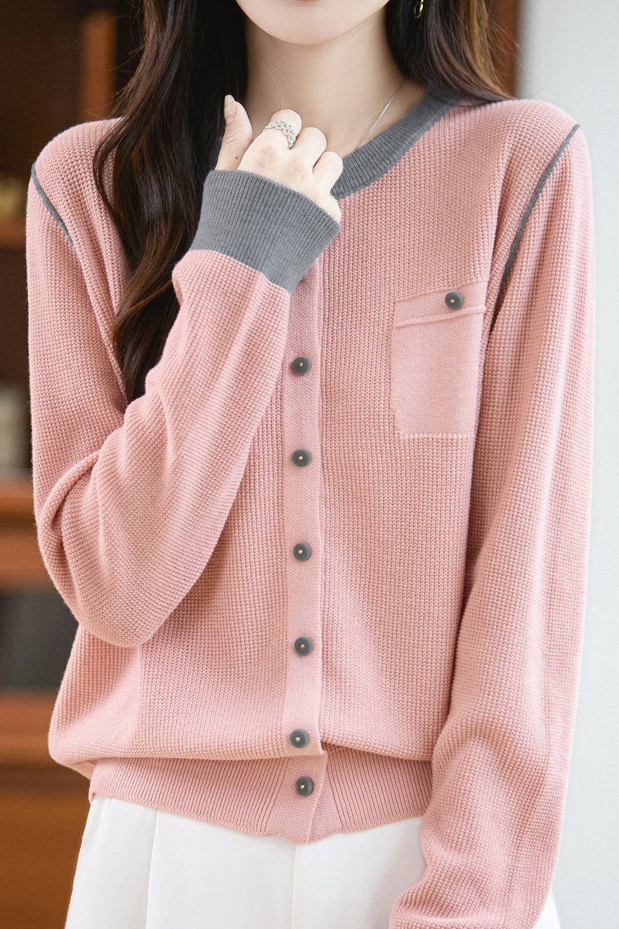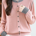Cardigan, crew neck placket design, neatly arranged buttons, neckline and cuffs with color-block paneling, patch pockets added for design sense, soft and skin-friendly knitted fabric, loose and comfortable fit |