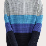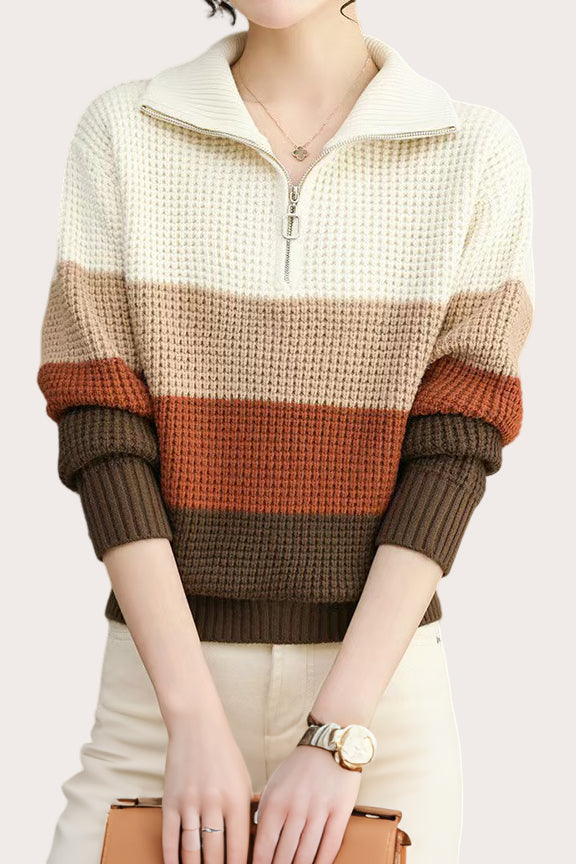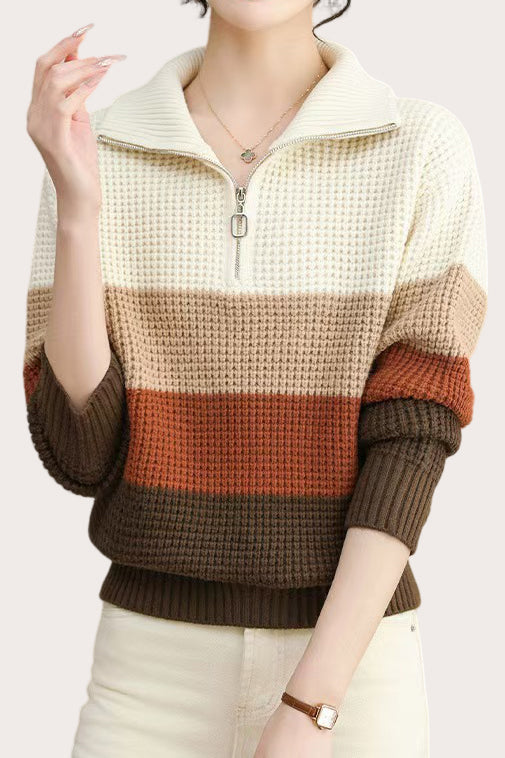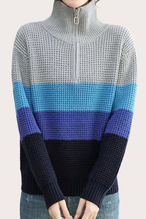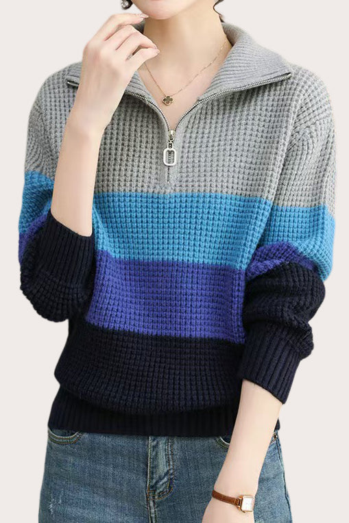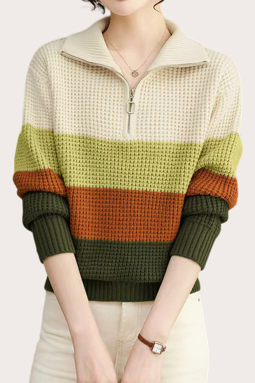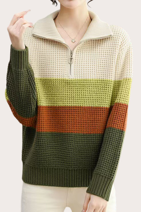 Pullover sweater, lapel long-sleeve loose fit, neckline half-zip design, body with color-block striped pattern |