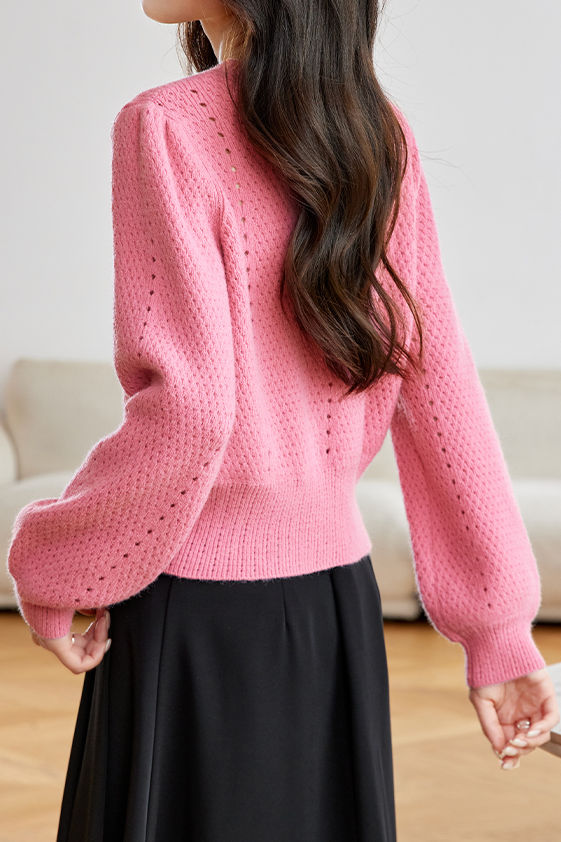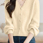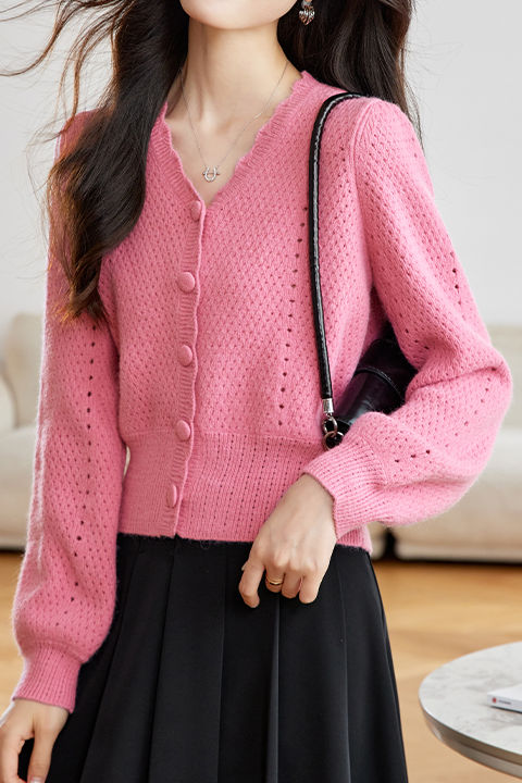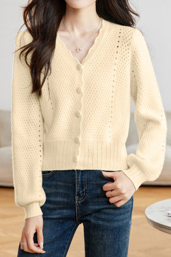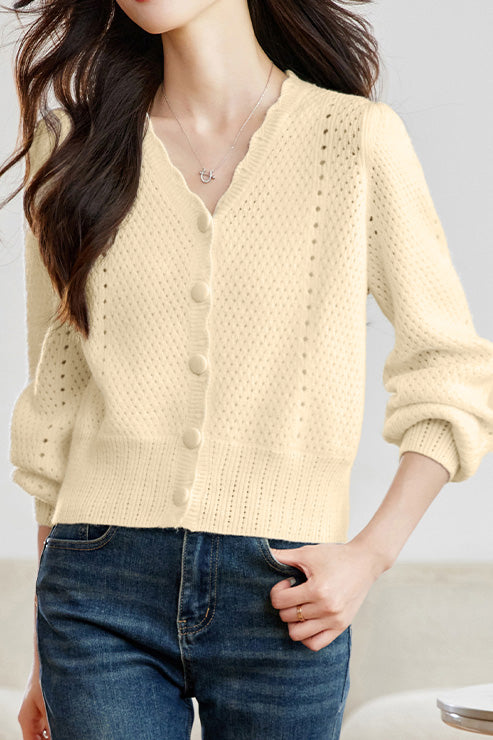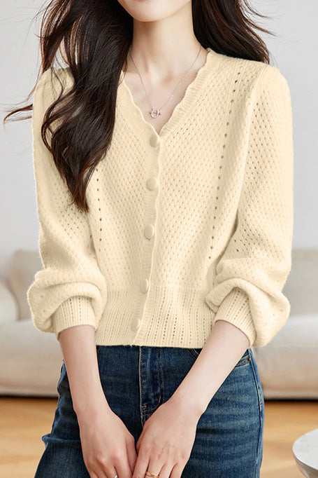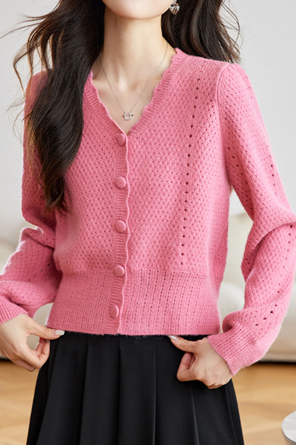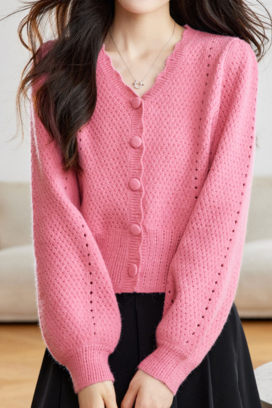 Knitted cardigan, v-neck long-sleeve short loose fit, solid-color body with hollow-out design, neckline with wave lace, front placket buttons unbuttonable |