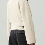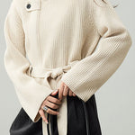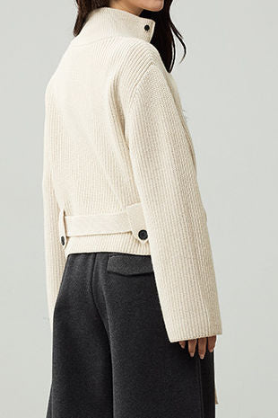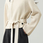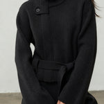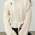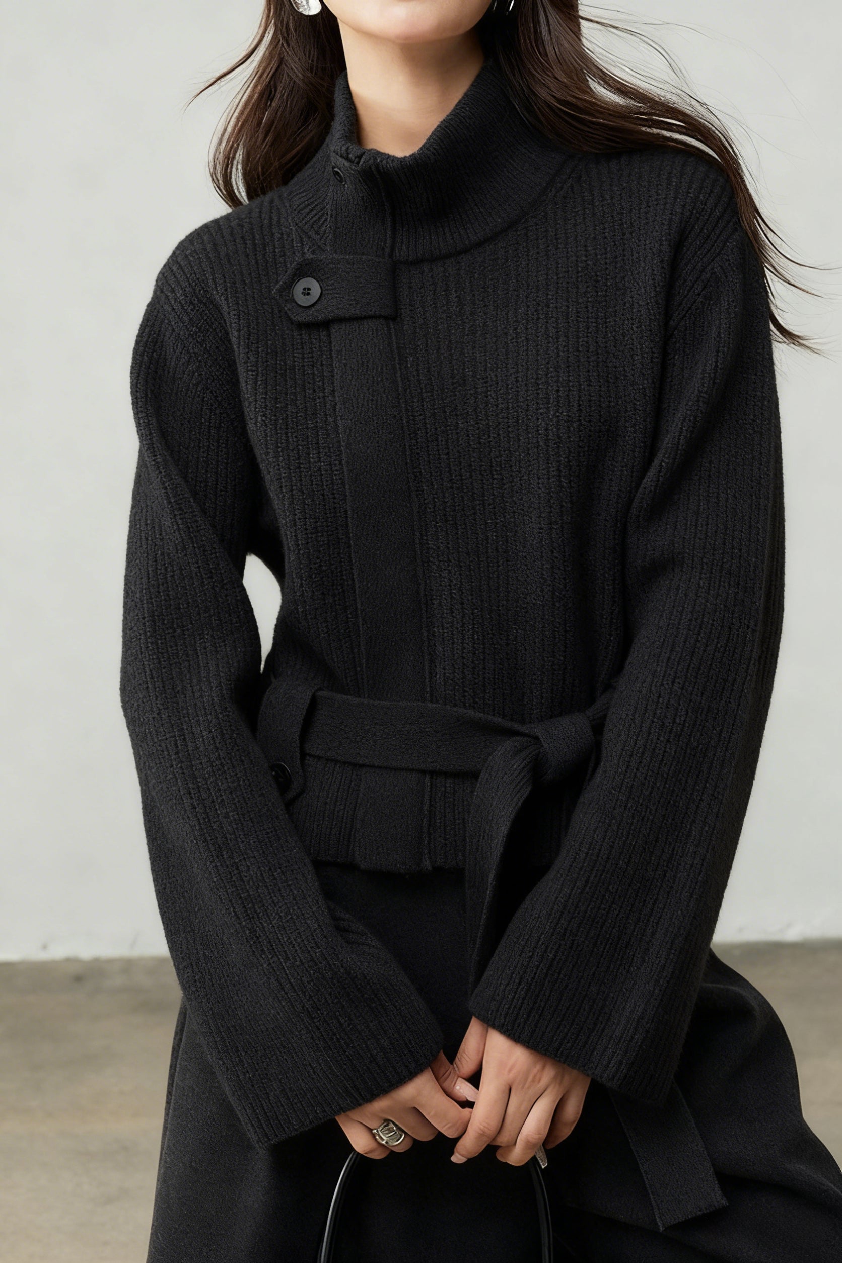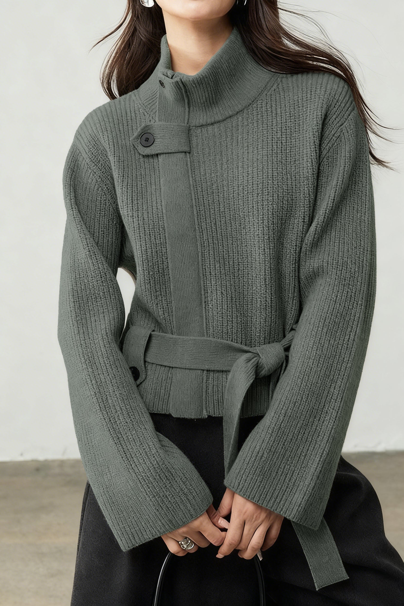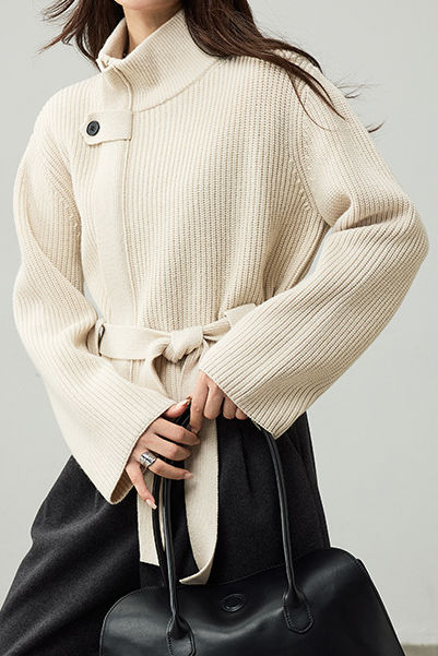 Knitted cardigan, stand collar long-sleeve loose fit, solid color, front placket with openable zipper, includes a detachable sash for custom styling |