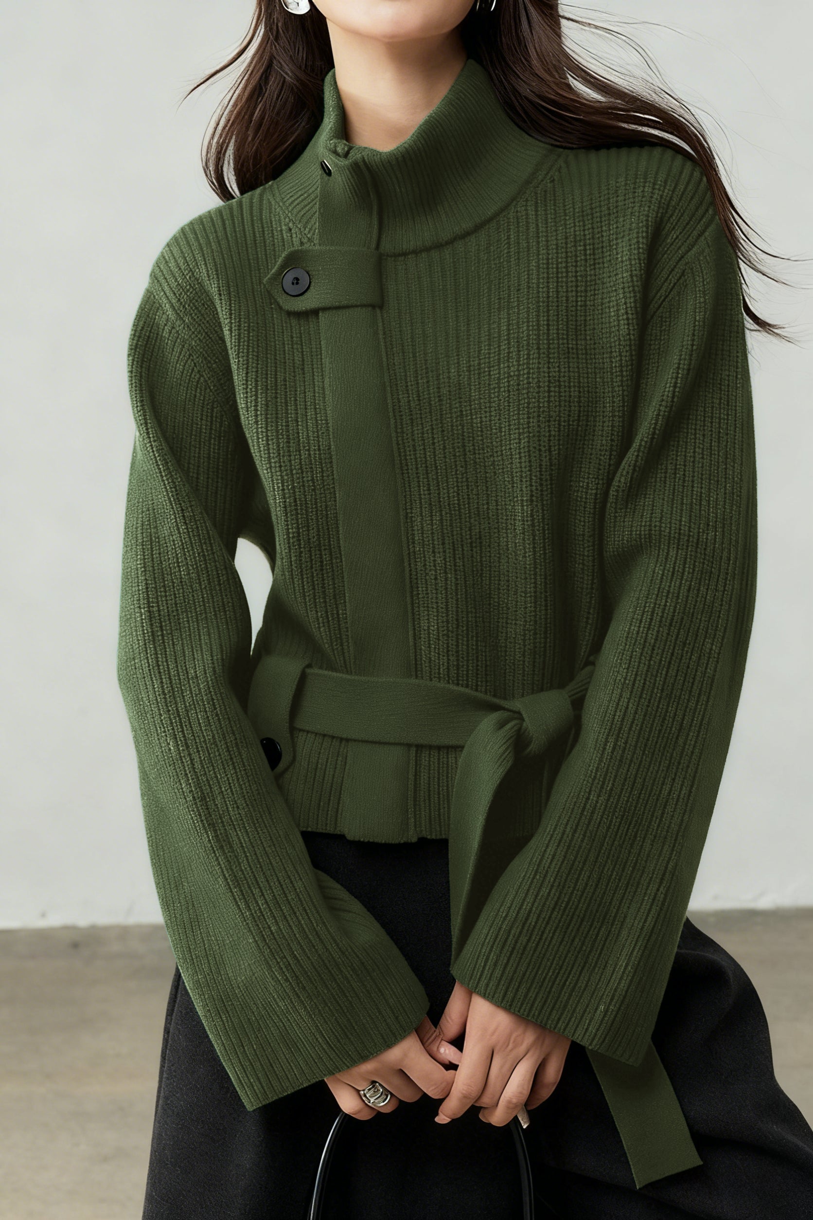 Casual Versatile Stand Collar Tie-Waist Solid-Color Knitted Cardigan
