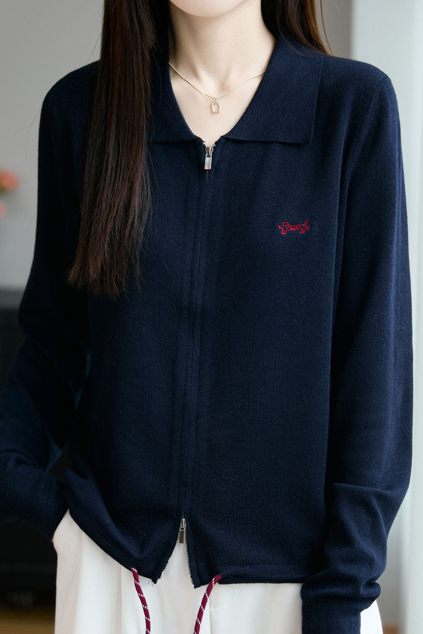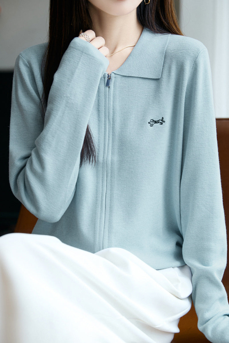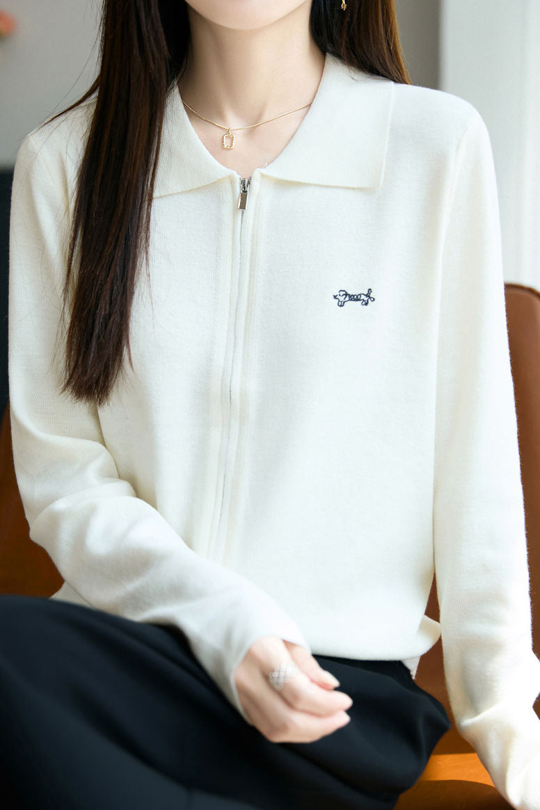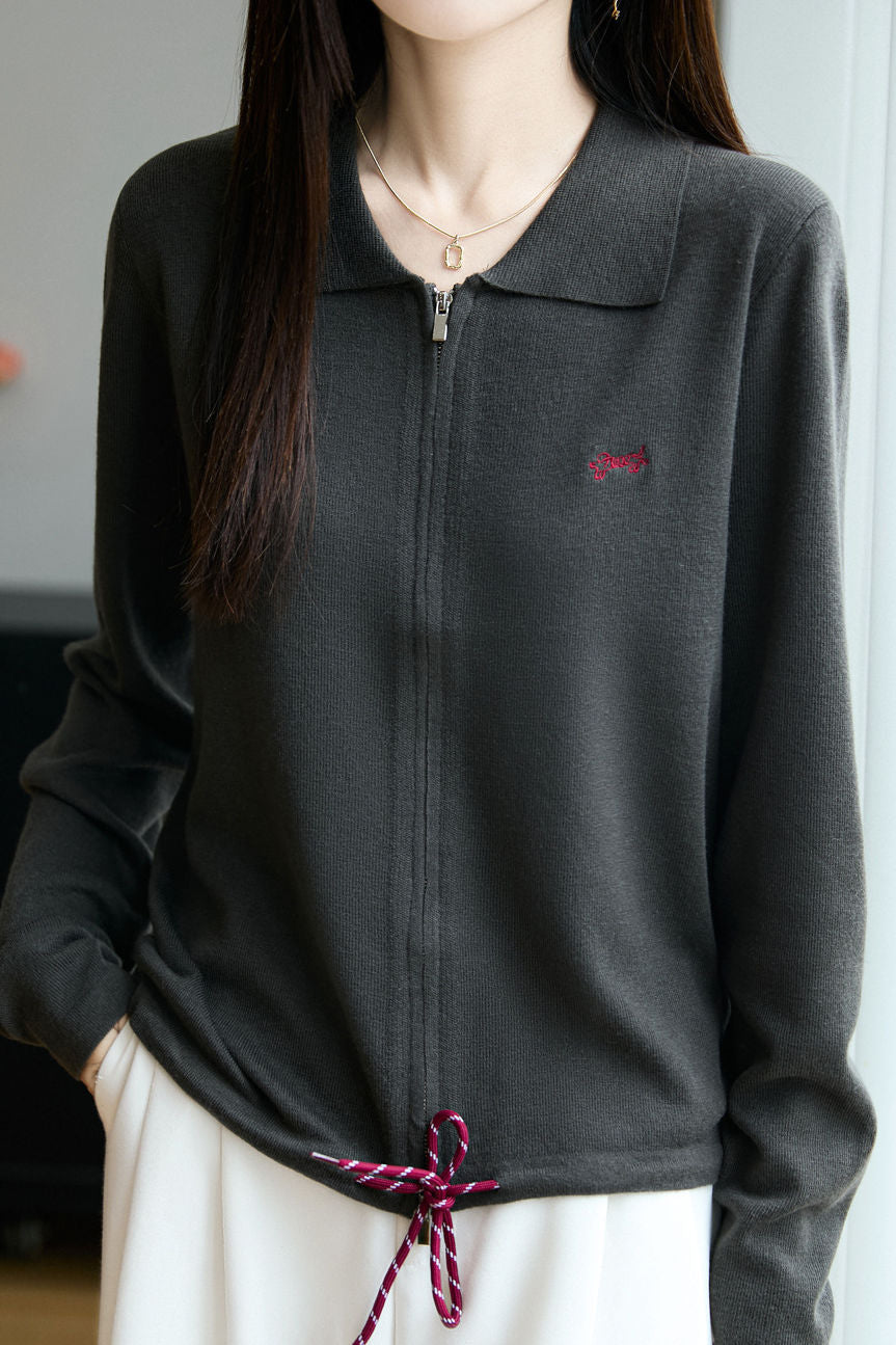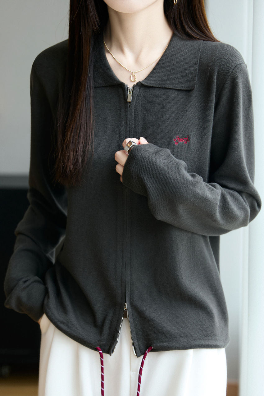Casual Versatile Lapel Solid-Color Embroidered Zipper Knitted Cardigan