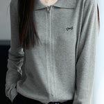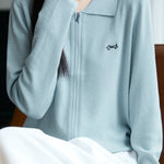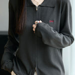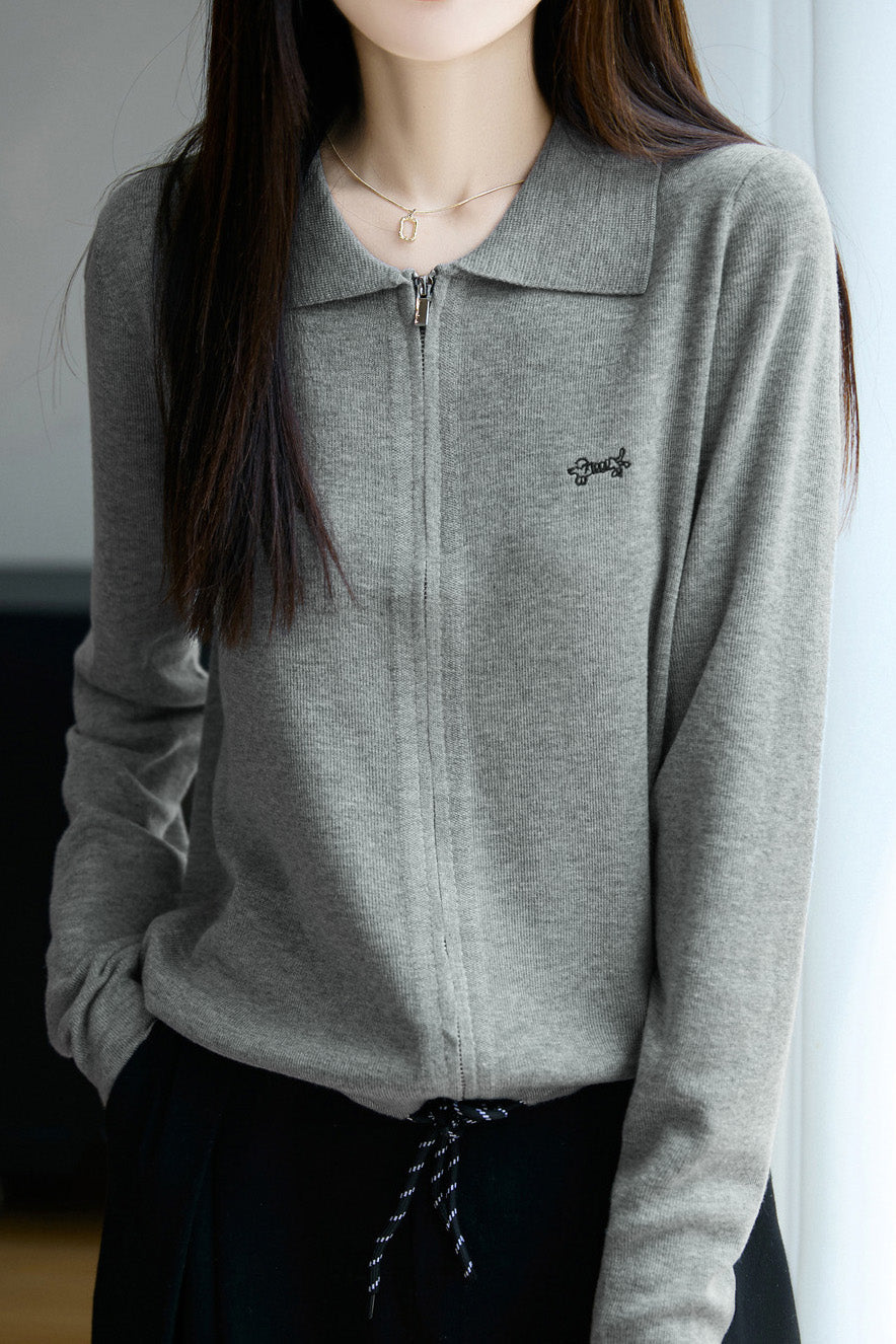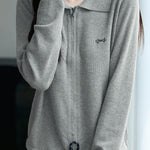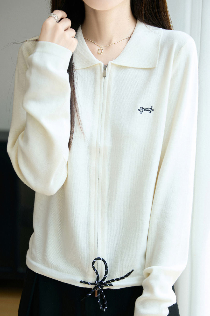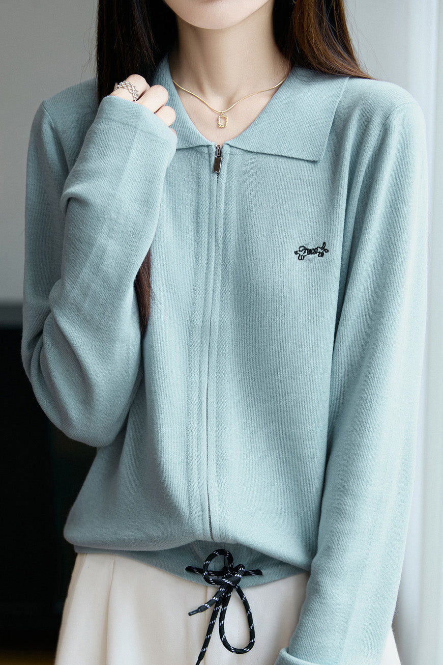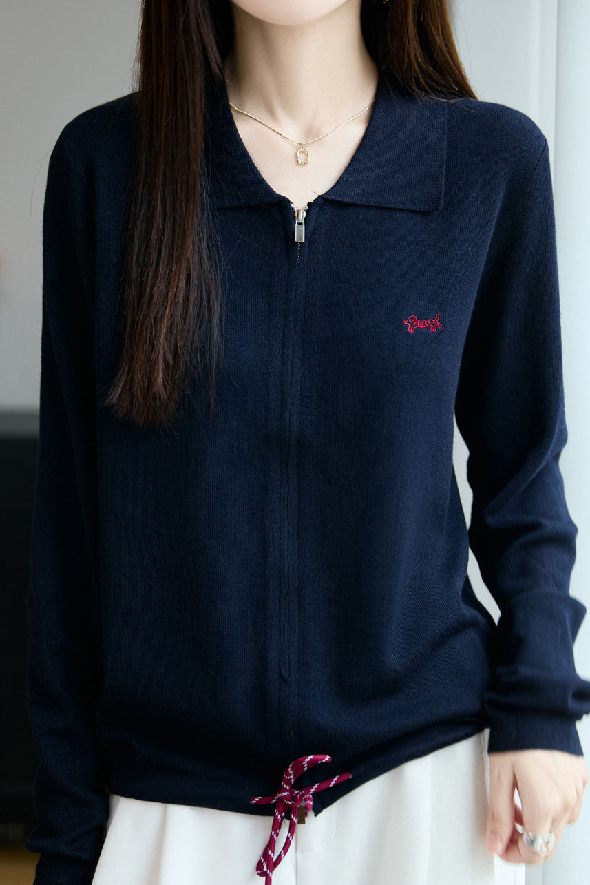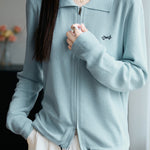 Casual Versatile Lapel Solid-Color Embroidered Zipper Knitted Cardigan