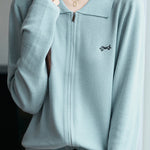 Knitted cardigan, lapel long-sleeve loose fit, front placket with openable zipper, hem with adjustable drawstring, chest with embroidered decoration |