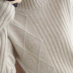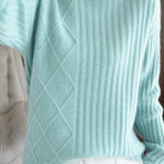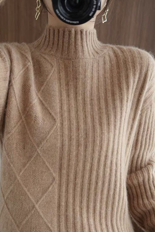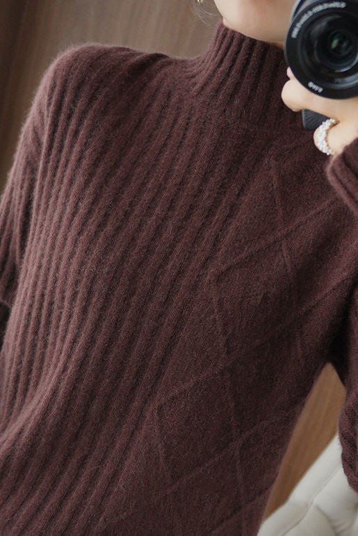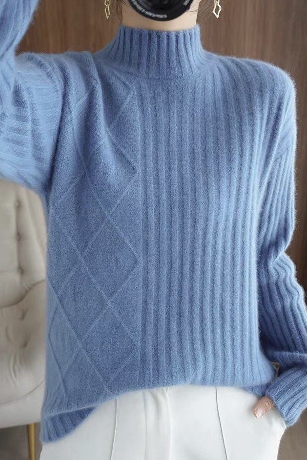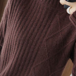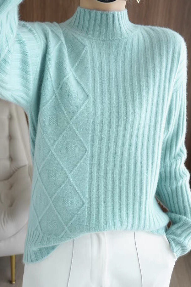 Pullover knitted top, half-high neck long-sleeve loose fit, body with argyle and striped ribbed texture design |