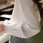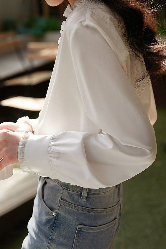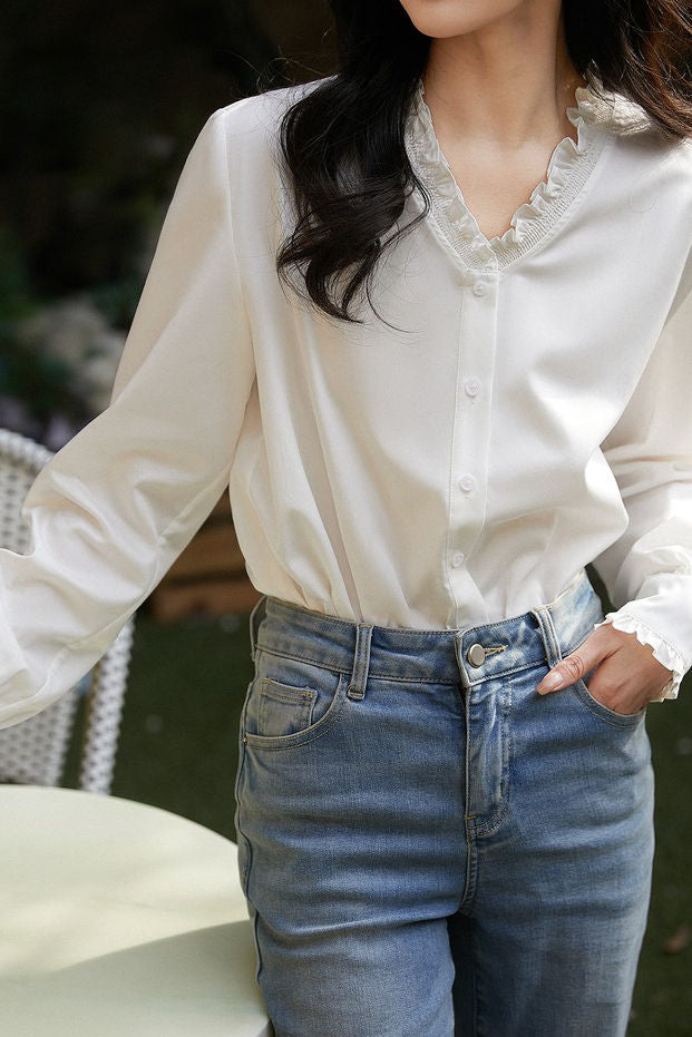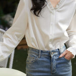 Shirt, v-neck long-sleeve loose fit, neckline and cuffs with ruffled design, front placket buttons unbuttonable |