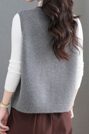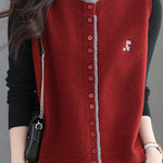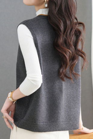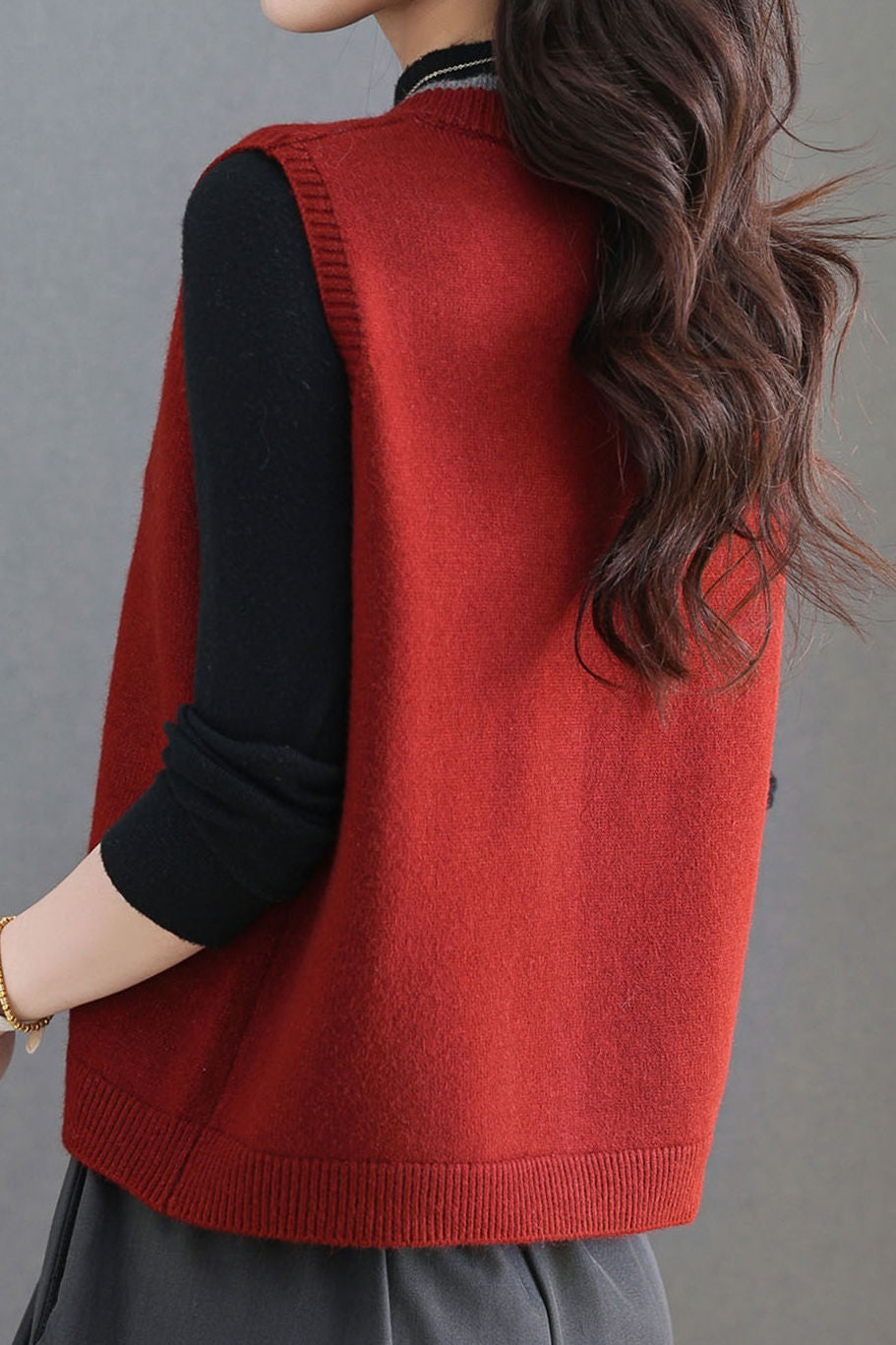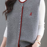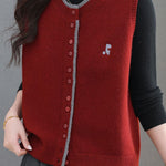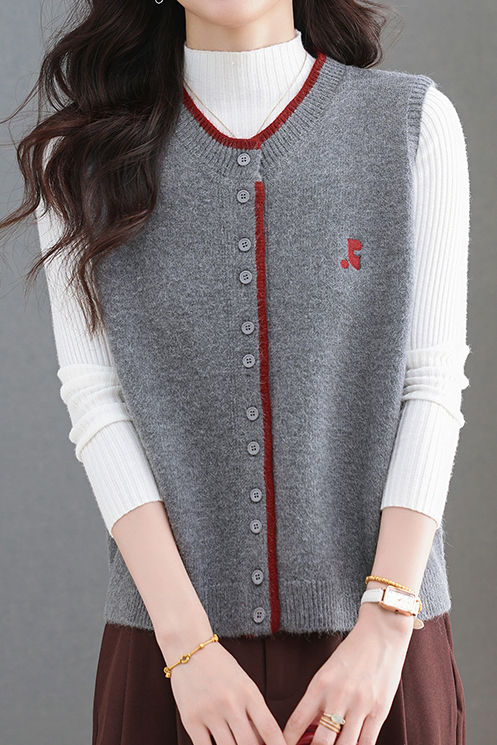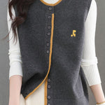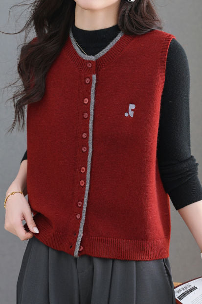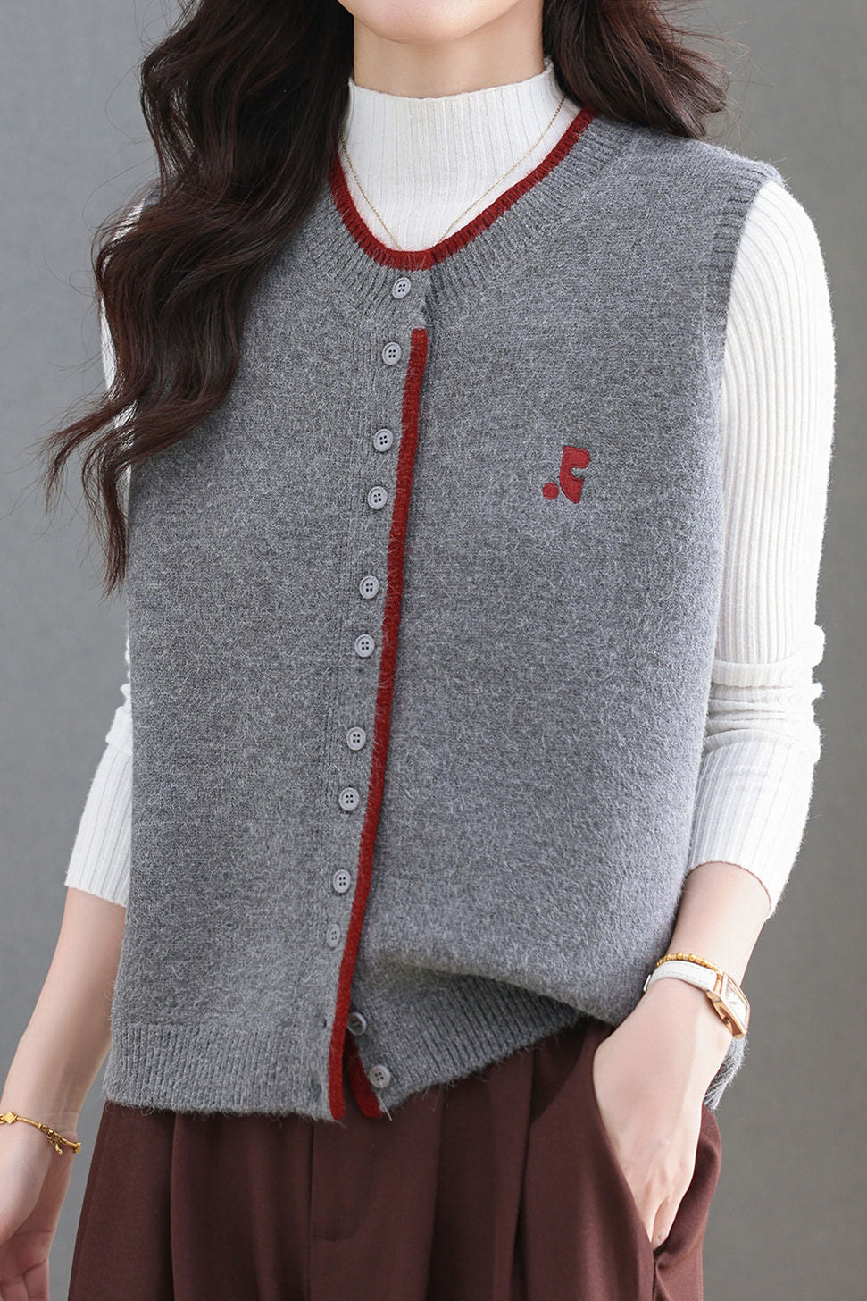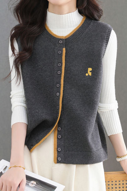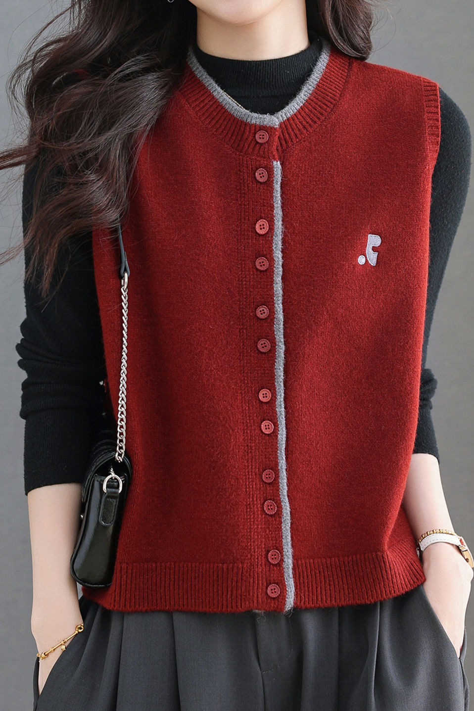 Vest, sleeveless placket design, neckline and placket with color-block binding, row of buttons for neat simplicity, small decorative label on the body for extra detail, soft knitted fabric |