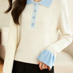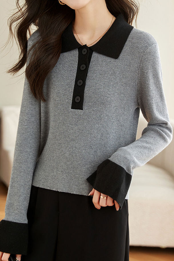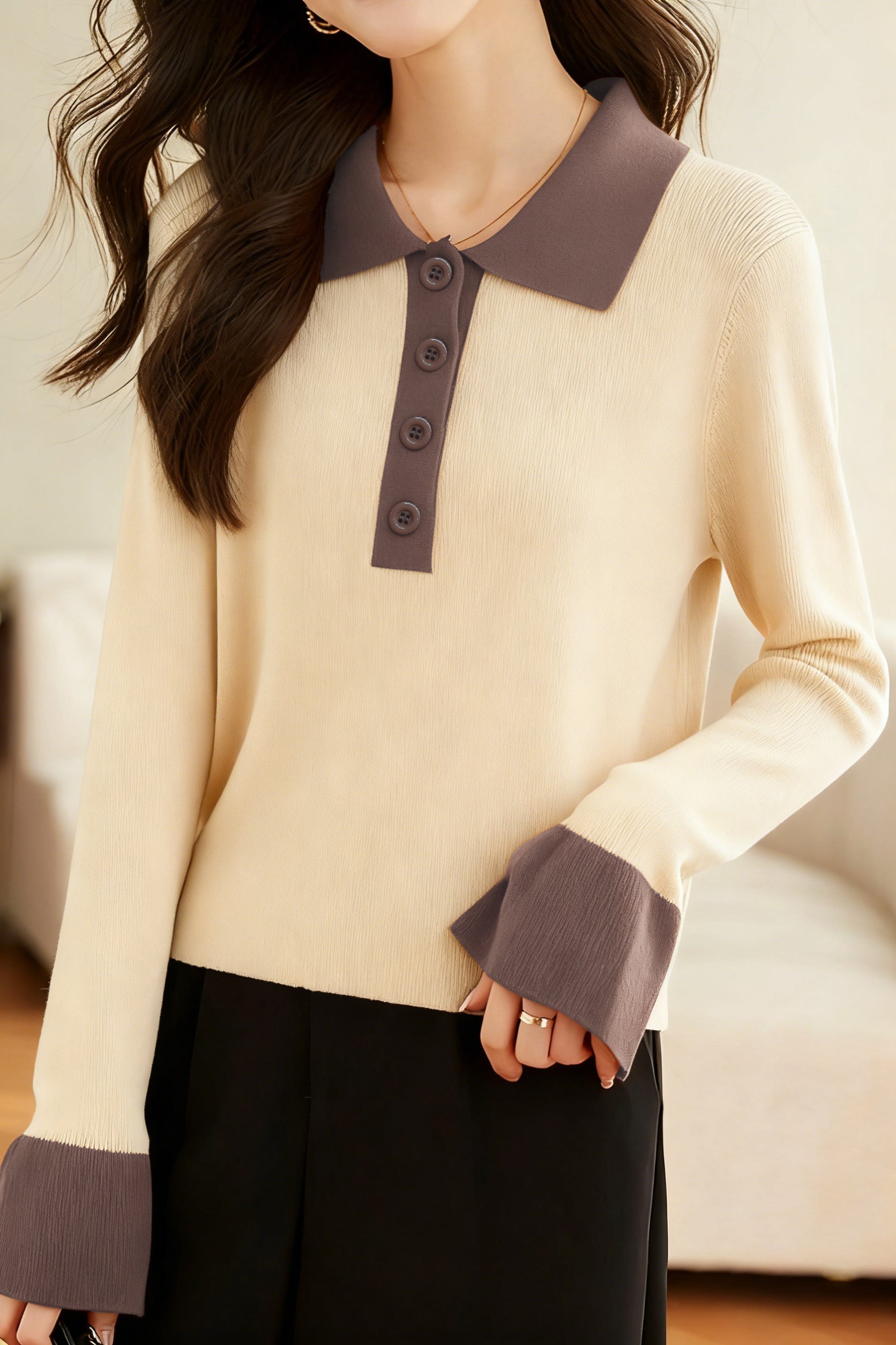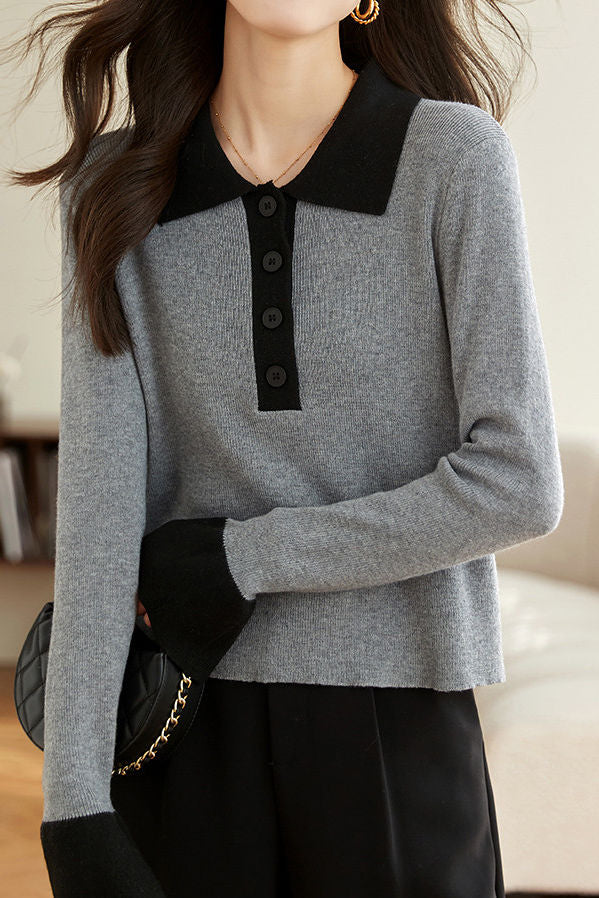 Pullover knitted top, lapel long-sleeve loose fit, neckline, cuffs and body with color-block design, neckline buttons unbuttonable |