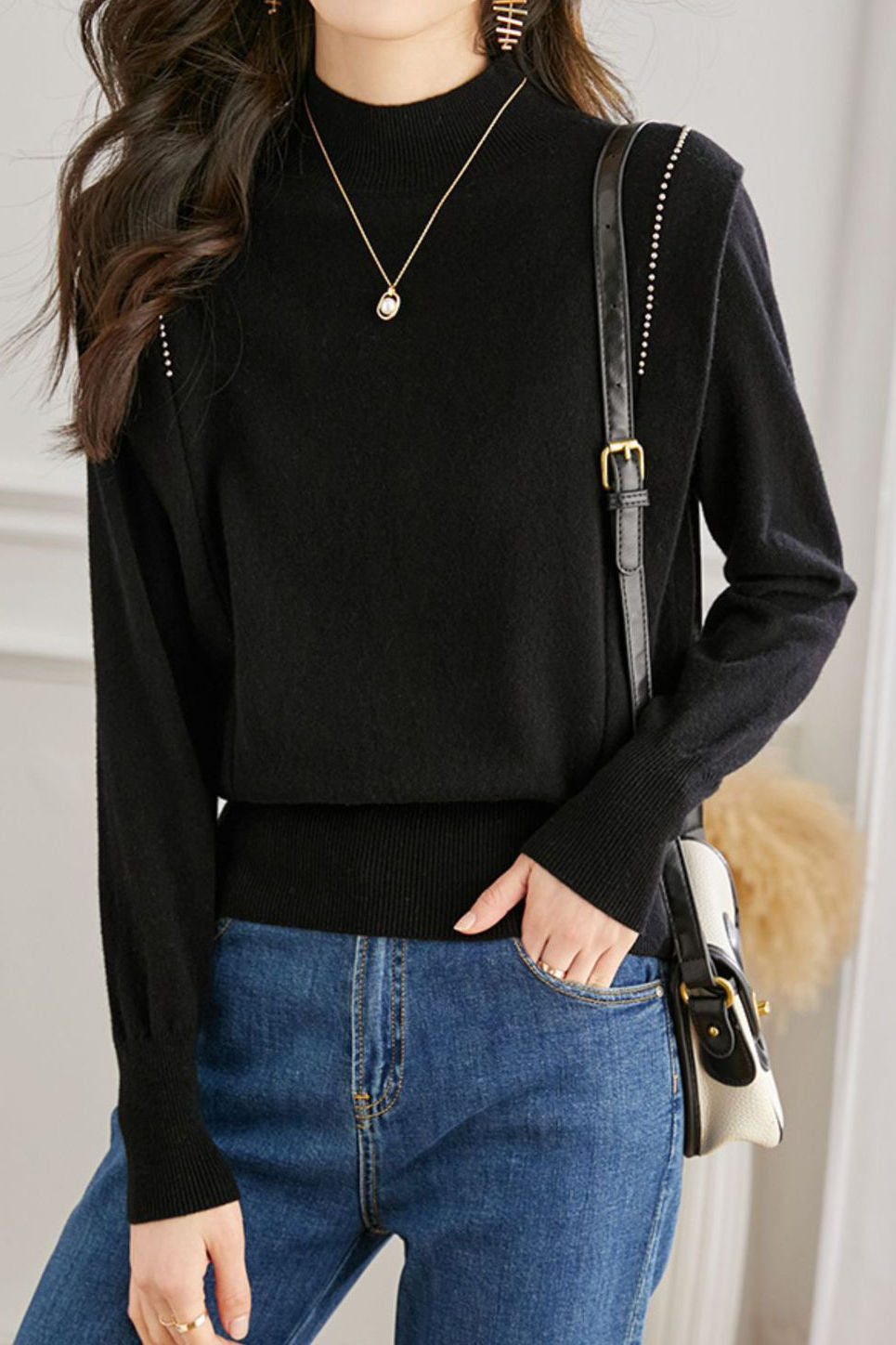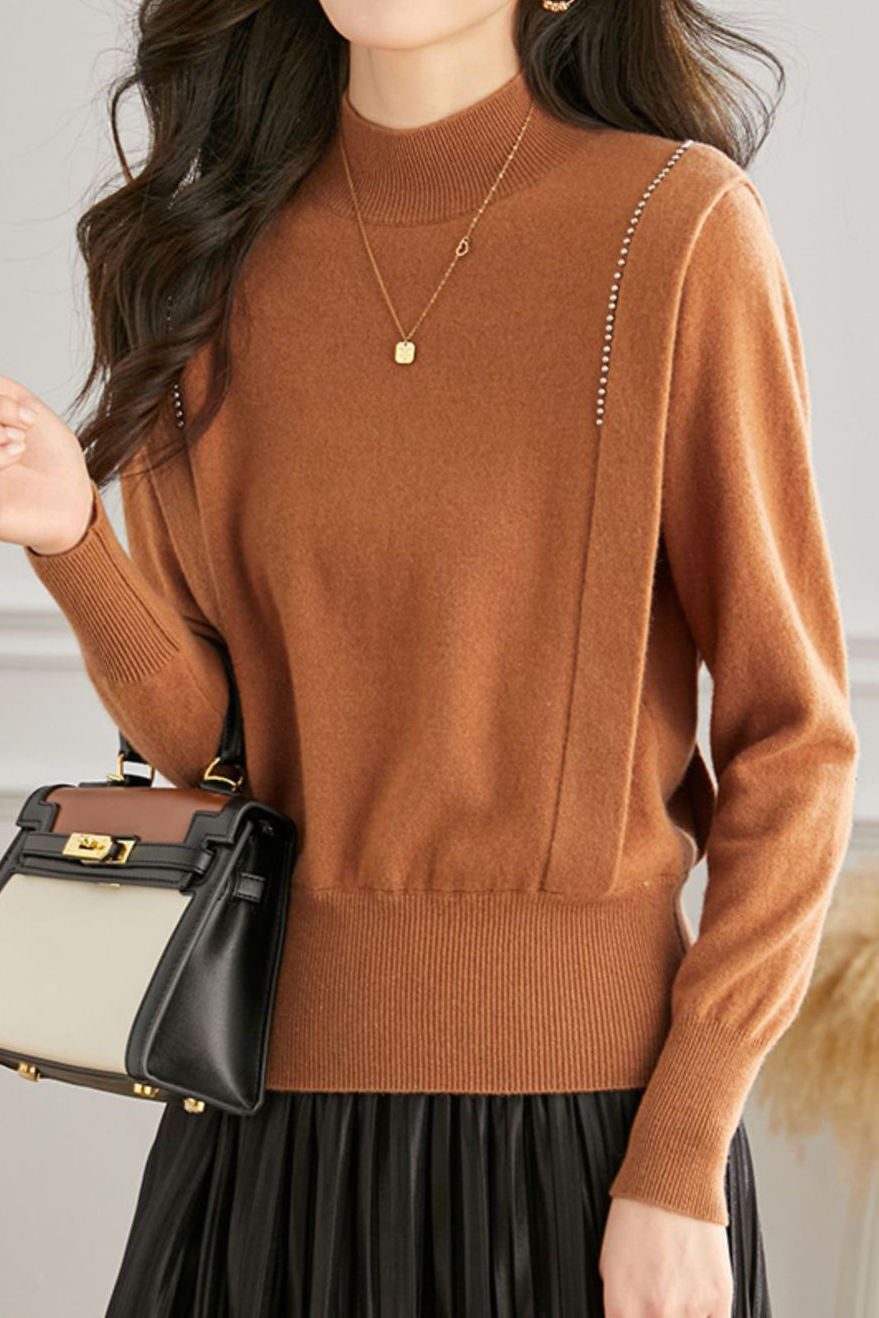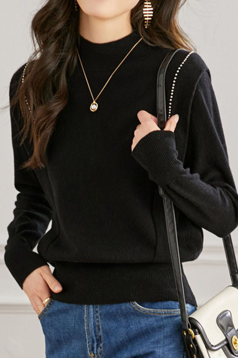 Pullover knitted top, half-high neck long-sleeve loose fit, high-waist cinched design, two decorative strips and silver beads on the shoulders |