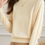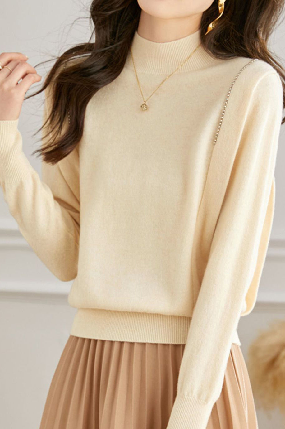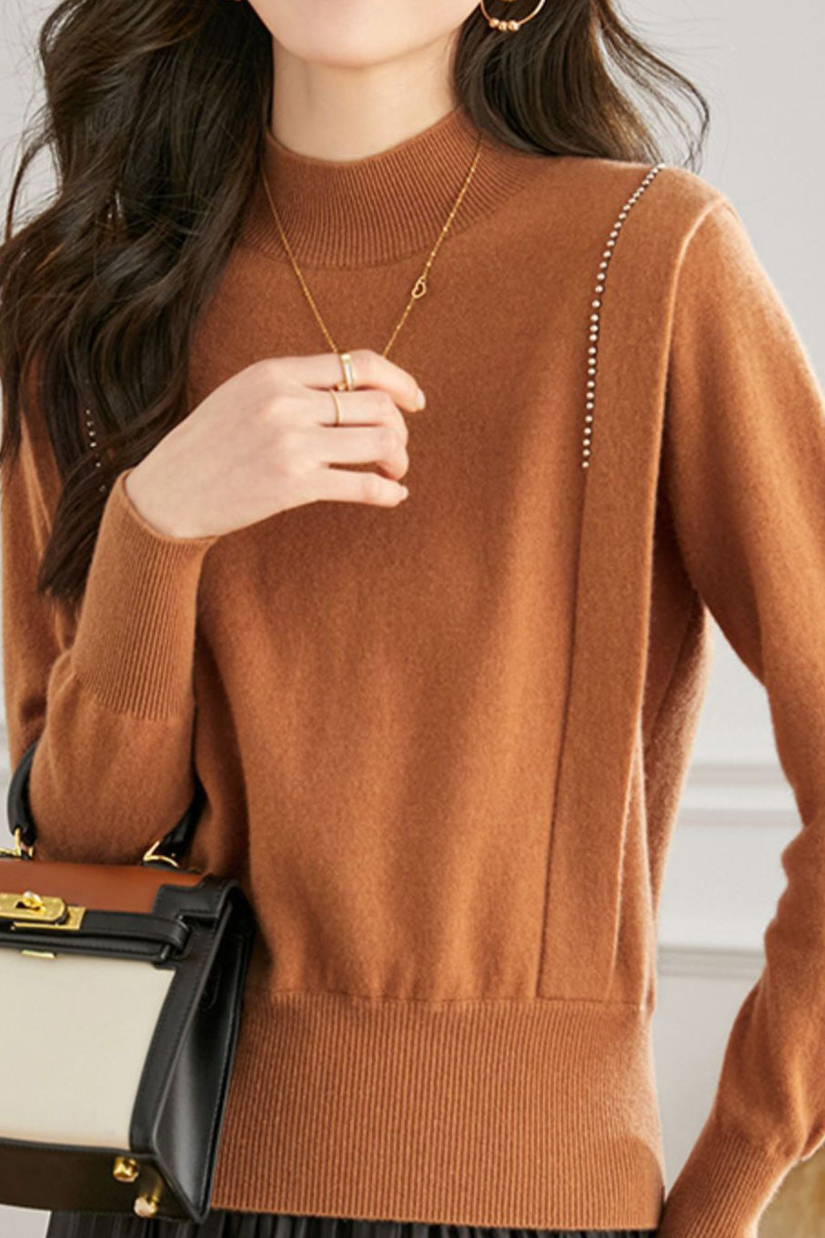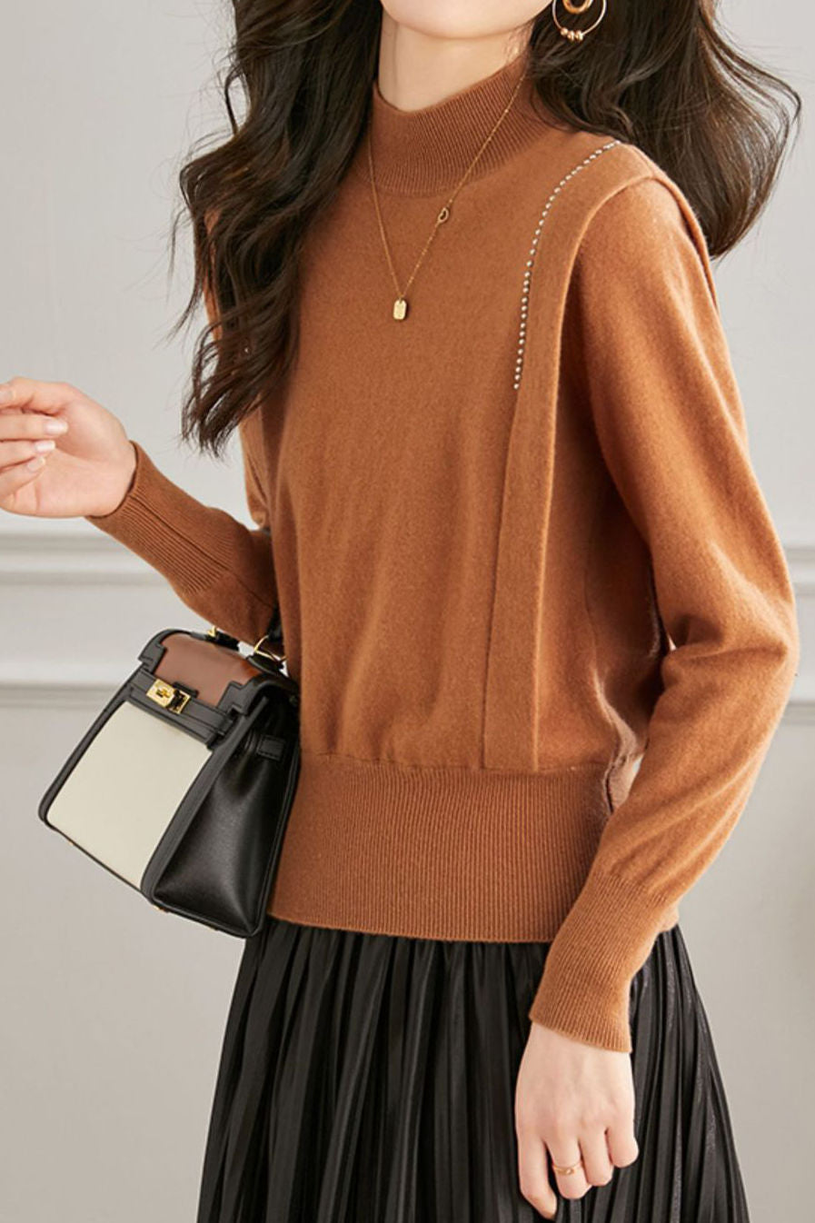 Pullover knitted top, half-high neck long-sleeve loose fit, high-waist cinched design, two decorative strips and silver beads on the shoulders |
