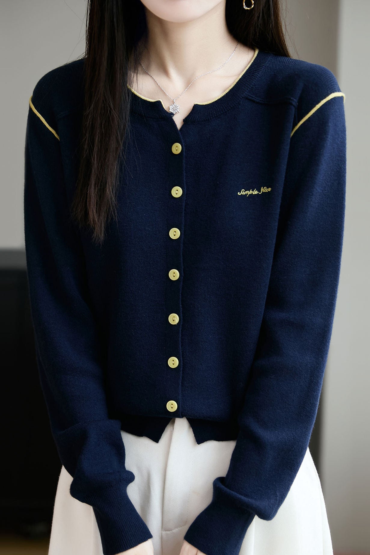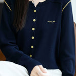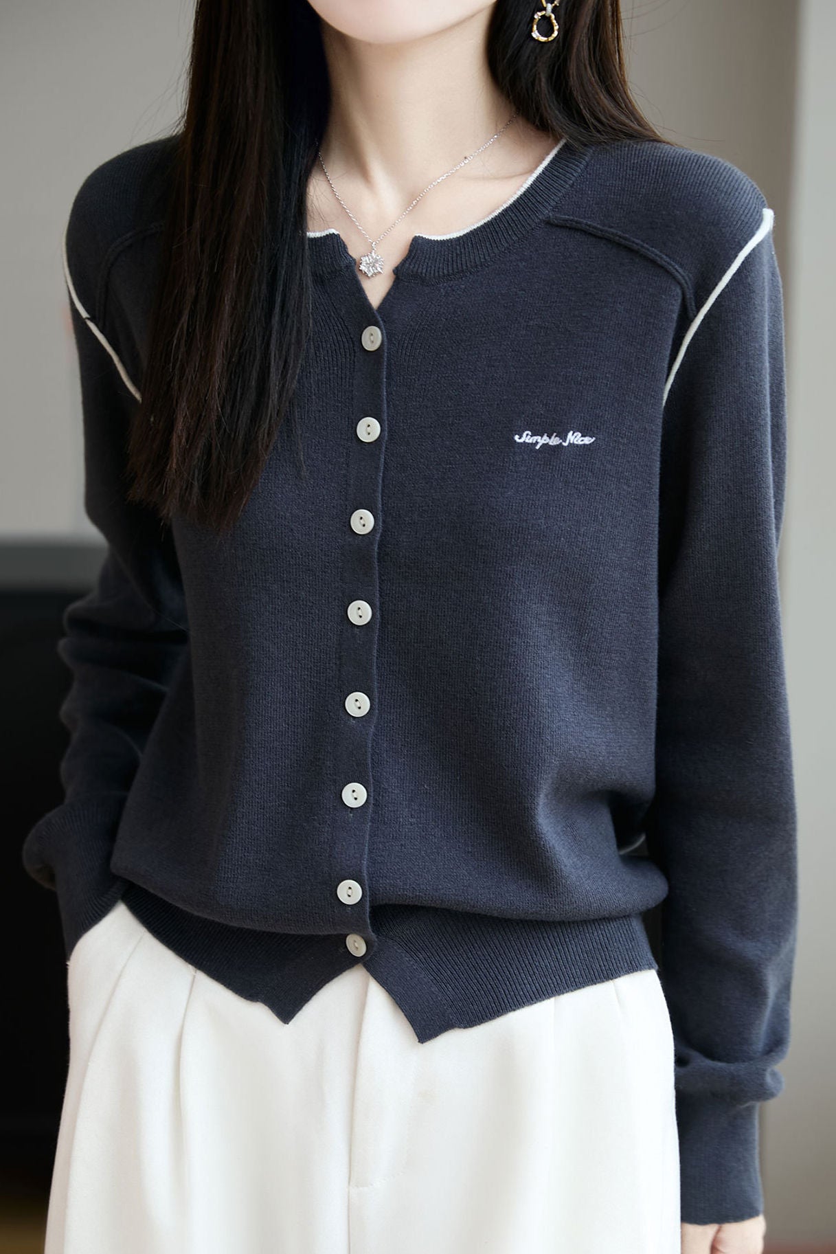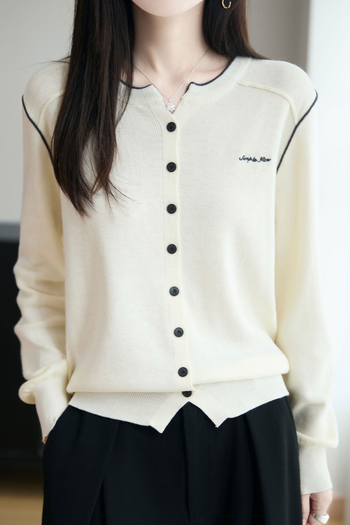 Knitted cardigan, v-neck long-sleeve loose fit, front placket unbuttonable, shoulders and neckline with color-block strip decorations, chest with embroidered pattern |