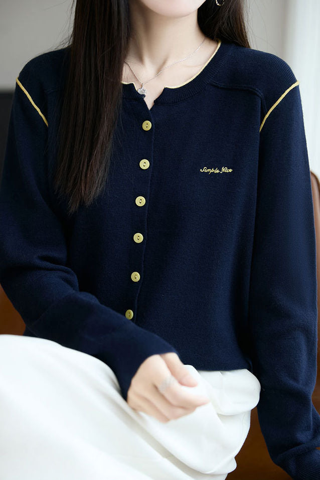 Casual Versatile V-Neck Embroidered Color-Block Knitted Cardigan