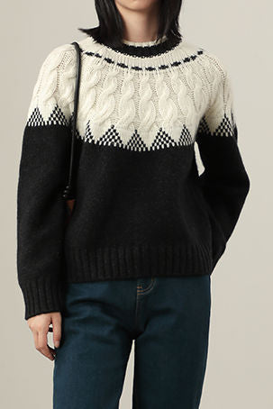 Pullover sweater, crew neck long-sleeve loose fit, upper body with diffused chunky cable-knit pattern, lower body with solid color for simple-complex contrast color-block design |
