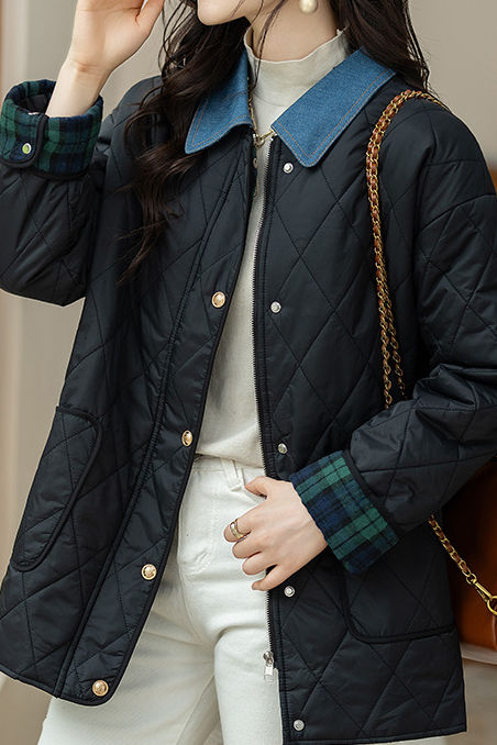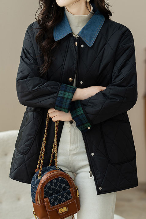 Cotton-padded coat, lapel long-sleeve loose fit, front center with openable snap buttons and zipper, collar with denim patchwork lapel design, cuffs with reversible color-block plaid patchwork, full-body solid-color argyle pattern |