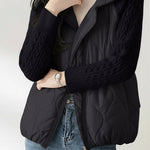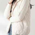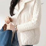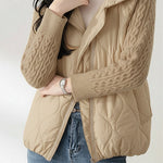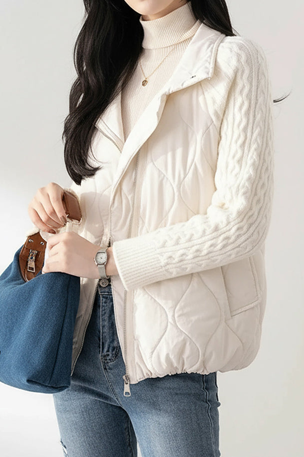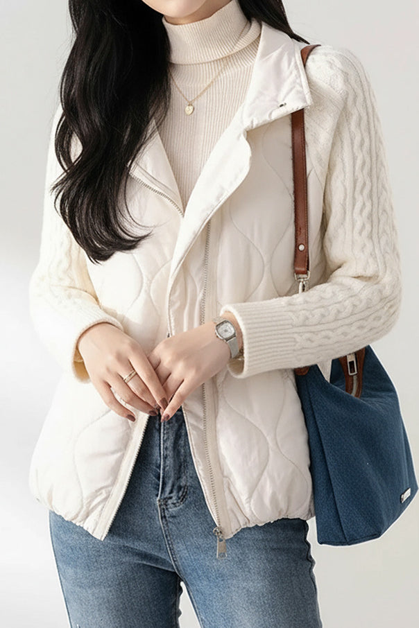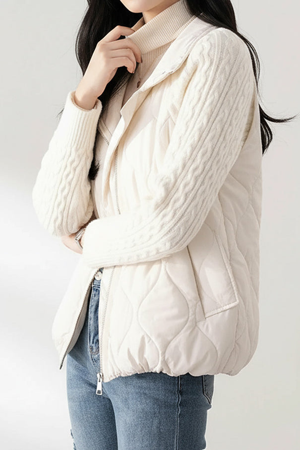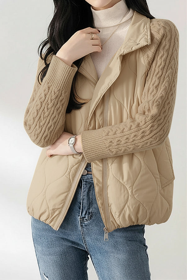 Jacket with a lapel, long sleeves, and a loose fit, featuring knitted sleeves and quilted cotton body, front zipper, and side pockets at the waist |