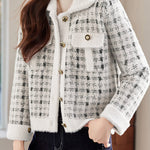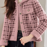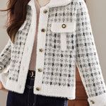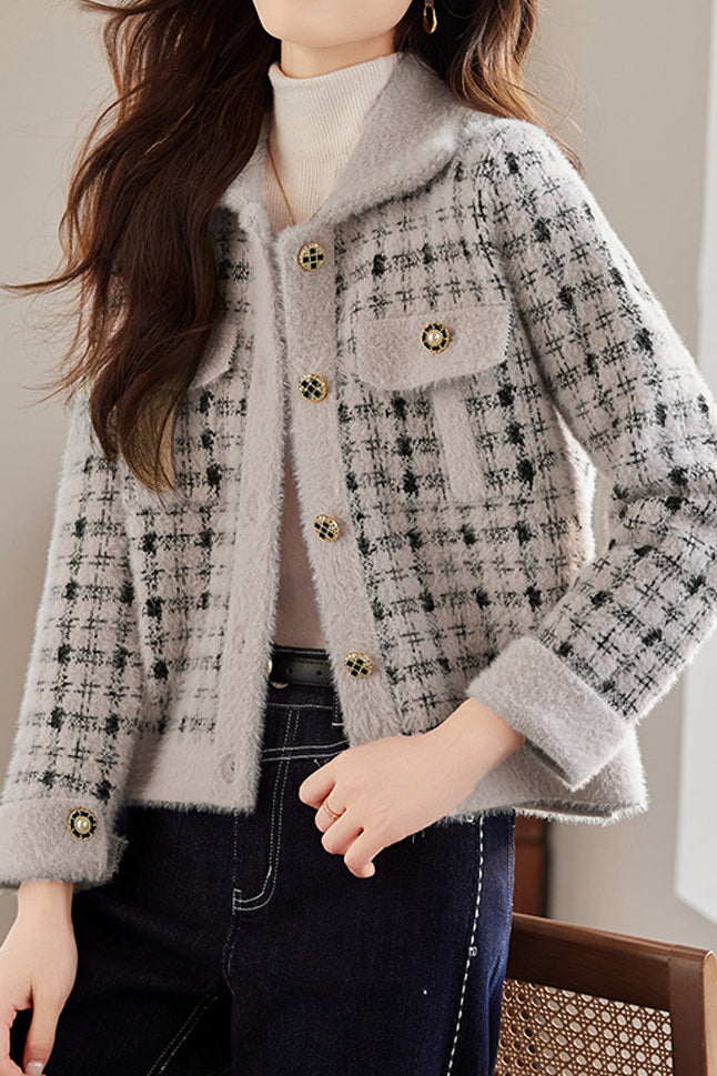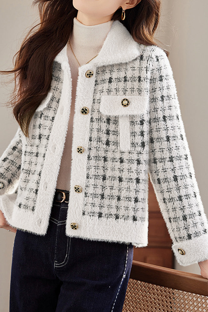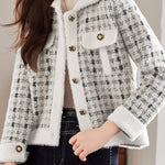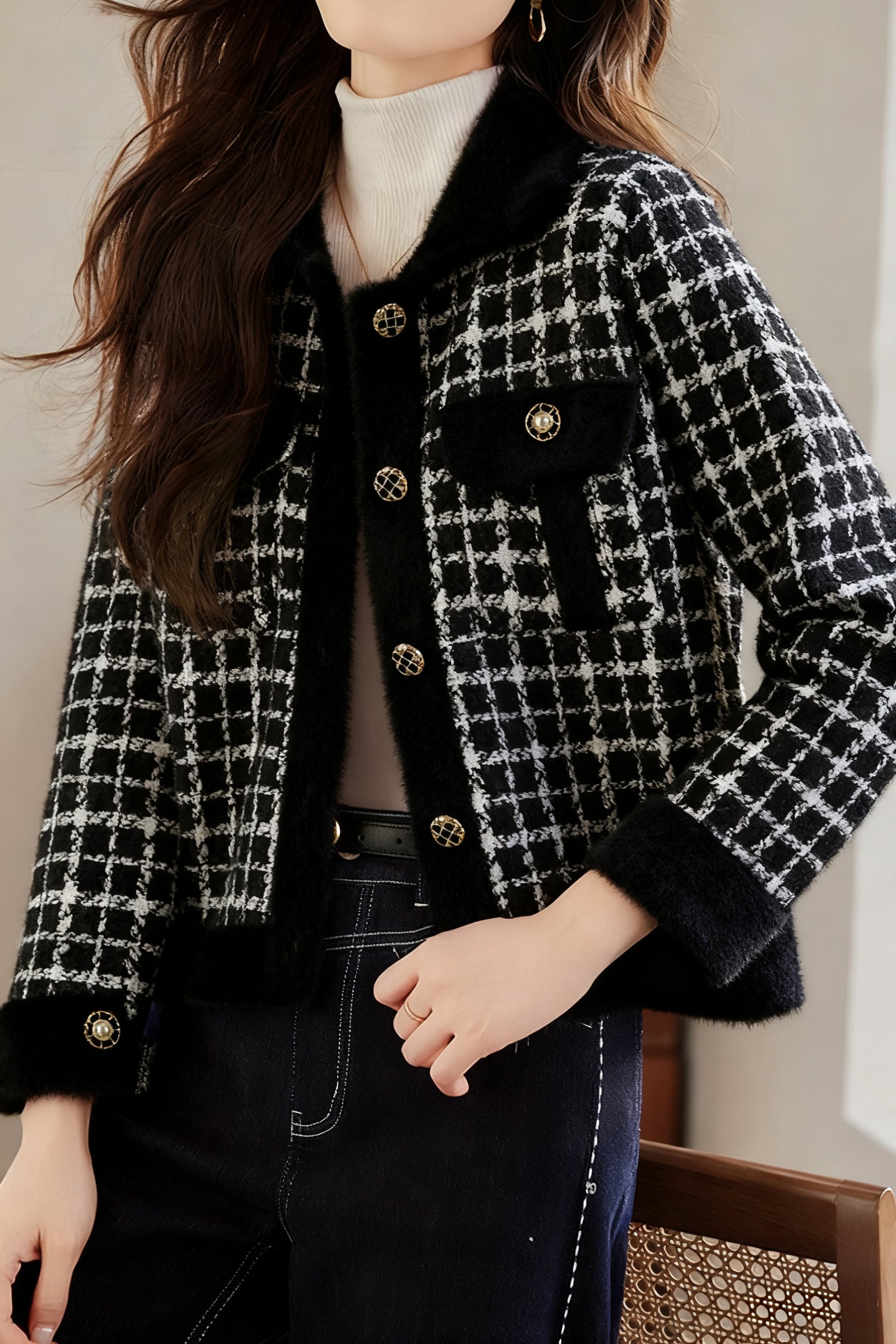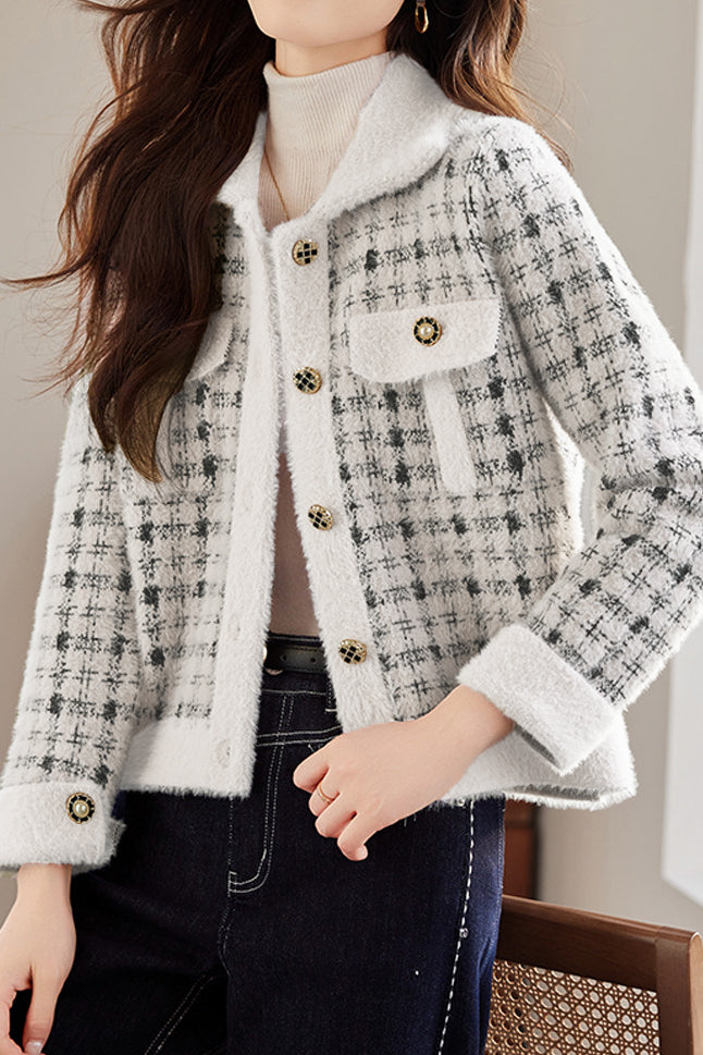 Coat, lapel placket long-sleeve loose fit, full-body color-block houndstooth design, placket, sleeve tabs and pocket loops with metal buttons, patch pockets on both sides of the chest |