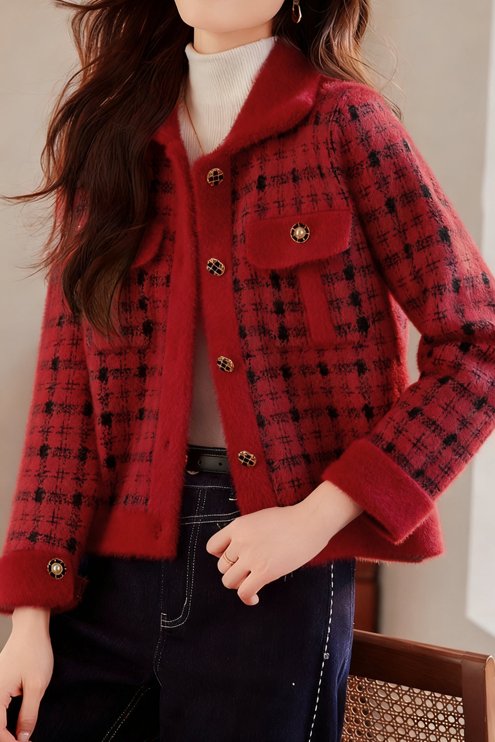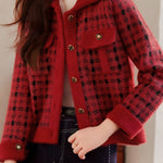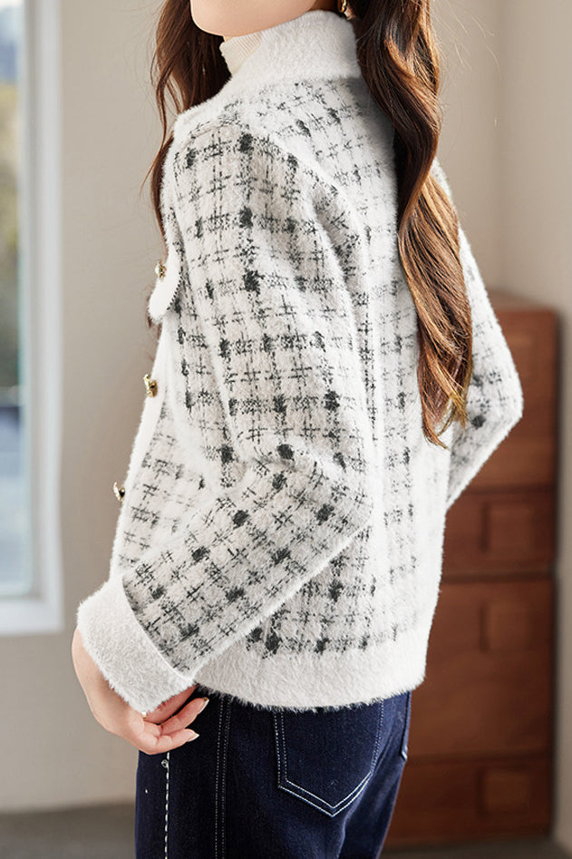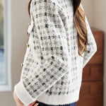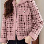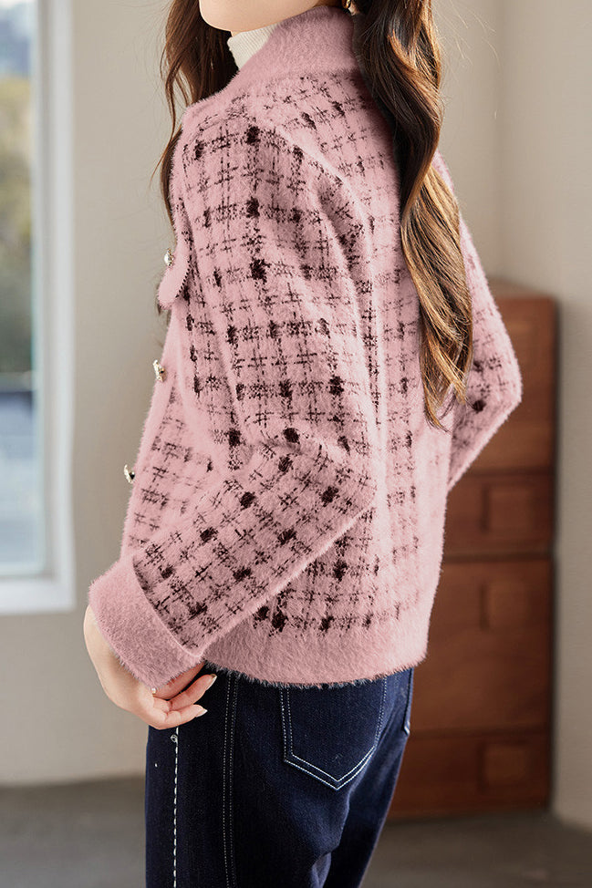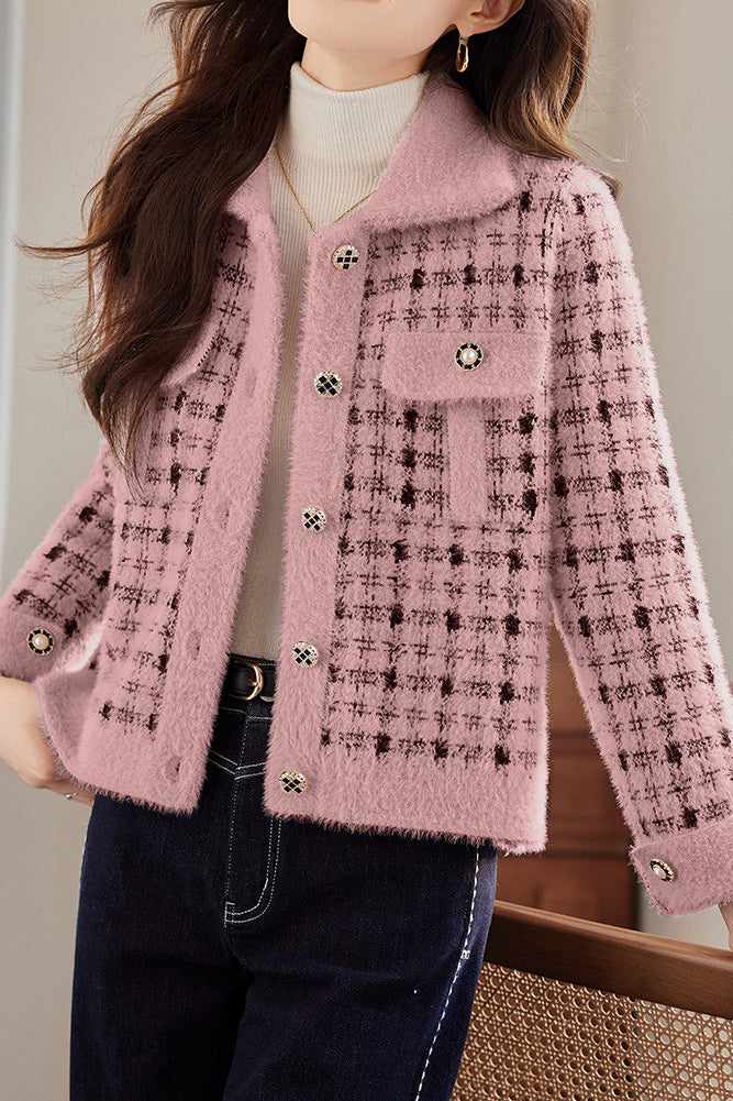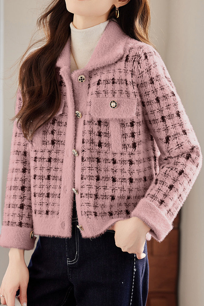 Coat, lapel placket long-sleeve loose fit, full-body color-block houndstooth design, placket, sleeve tabs and pocket loops with metal buttons, patch pockets on both sides of the chest |