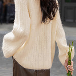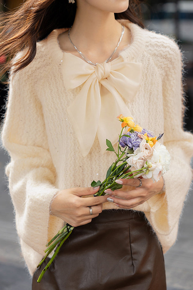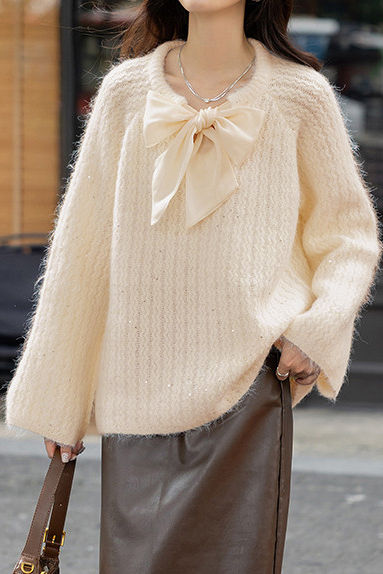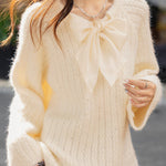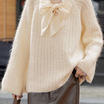 Exquisite Crew Neck Ribbed Ribbon-Decorated Sweater