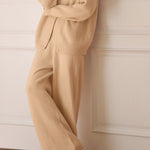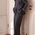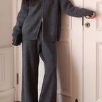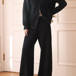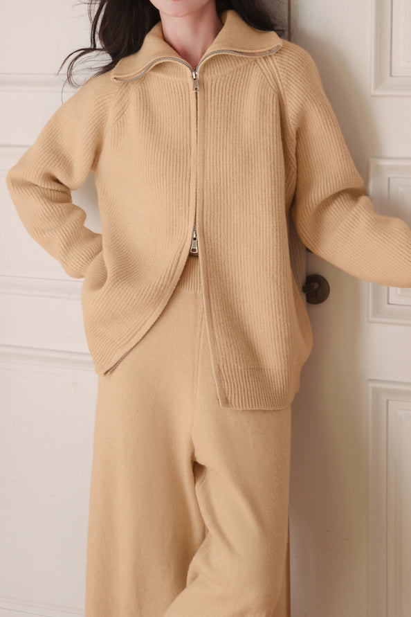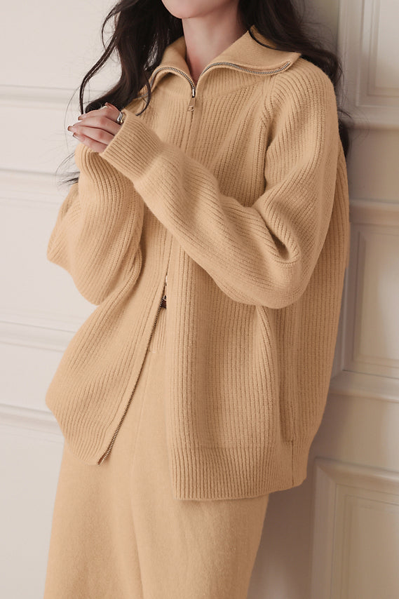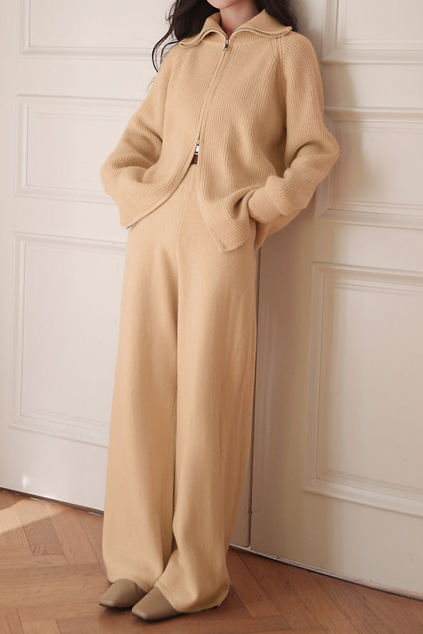 Cardigan and pants two-piece set, full-body solid-color design, cardigan with lapel long sleeves and front center openable double zippers; pants are solid-color wide-leg pants |