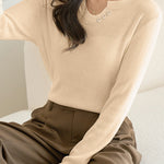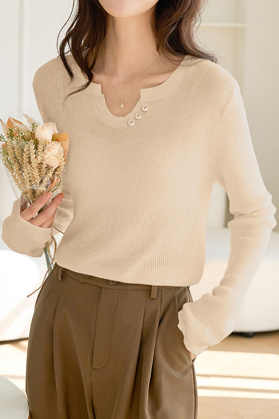 Knitted top, v-notch crew neck long-sleeve loose fit, decorative button on one side of the neckline, full-body fine ribbed knitted design |