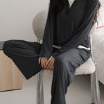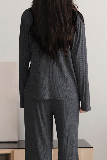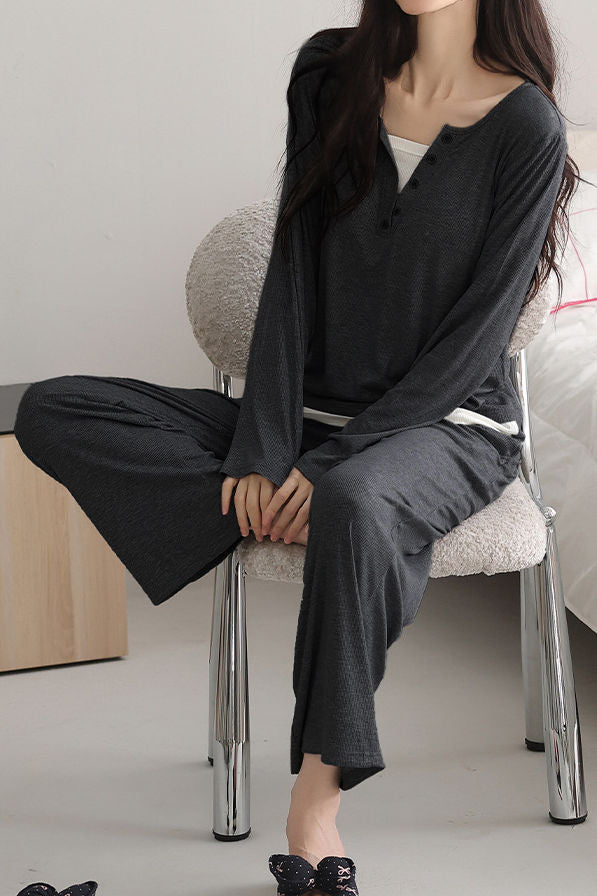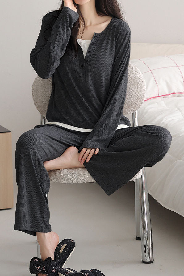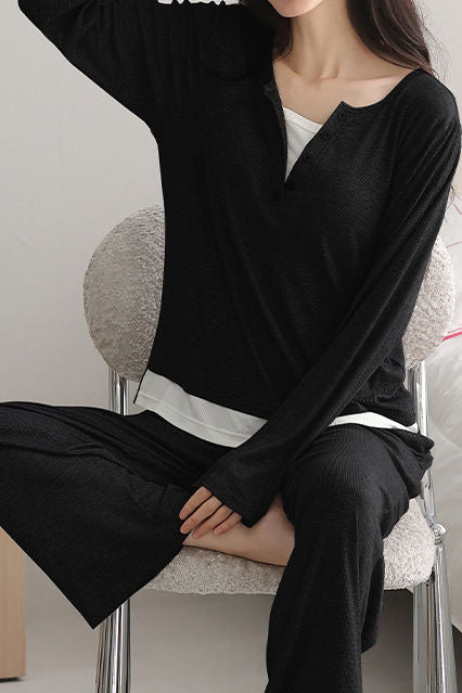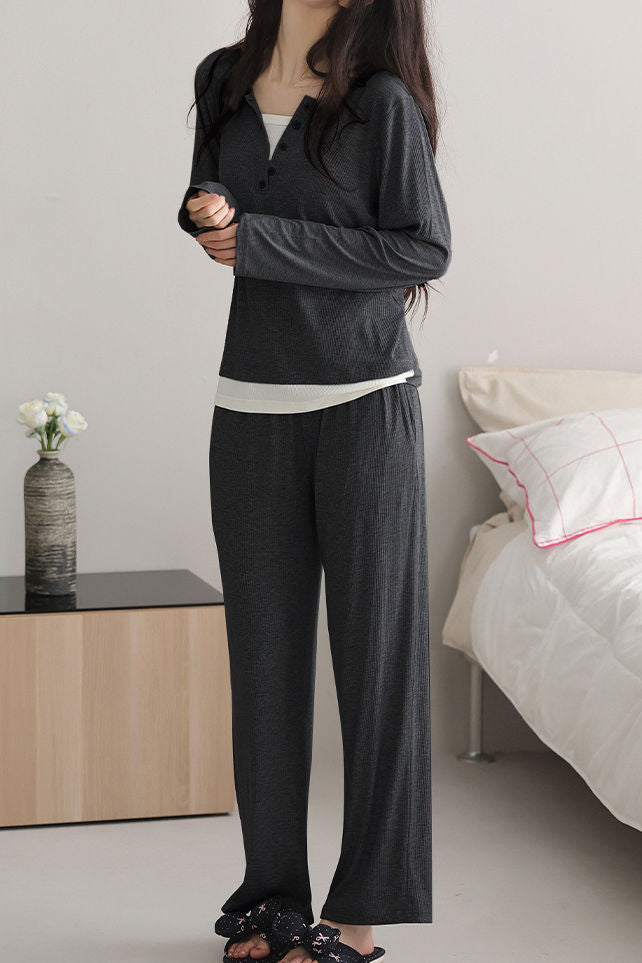 Knitted fake two-piece set, coordinated set design, top with half-placket fake two-piece fit, fabric with vertical texture for a soft touch, bottom with loose straight fit |