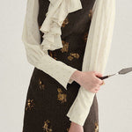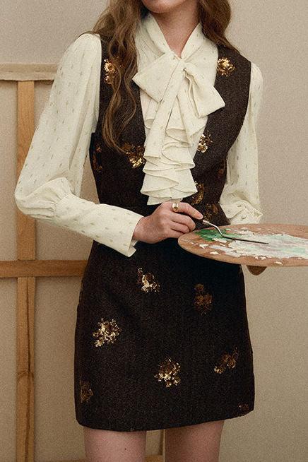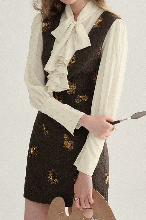 Camisole dress two-piece set, shirt with openable placket buttons and adjustable neck ties; camisole dress with v-neck sleeveless waist cinching design, body adorned with sequins, back with invisible zipper for easy wearing |