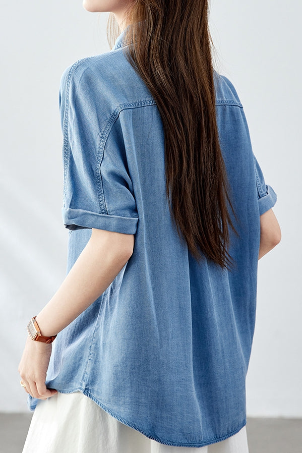 Casual Retro Denim Blue Short Sleeve Shirt