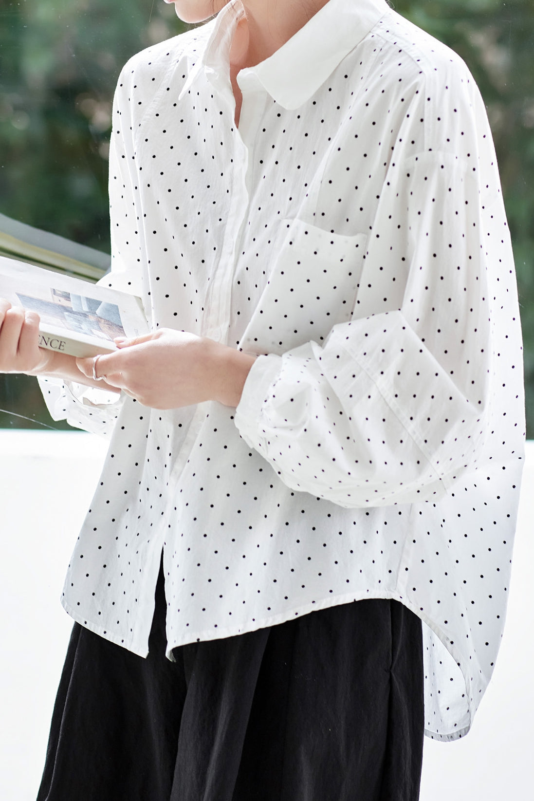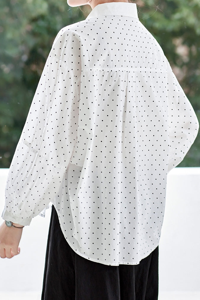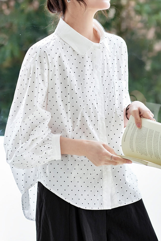 Shirt,lapel,long sleeve,button front,loose fit,white base with black polka dots all over,shirred lantern sleeve cuffs,single-breasted button placket,patch pockets at front |