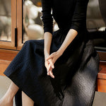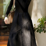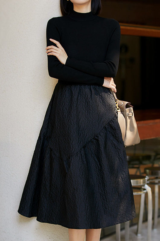 Dress, top part with solid-color half-high neck fine ribbed knitted design, waist to hem with solid-color special embossed wrinkled texture |