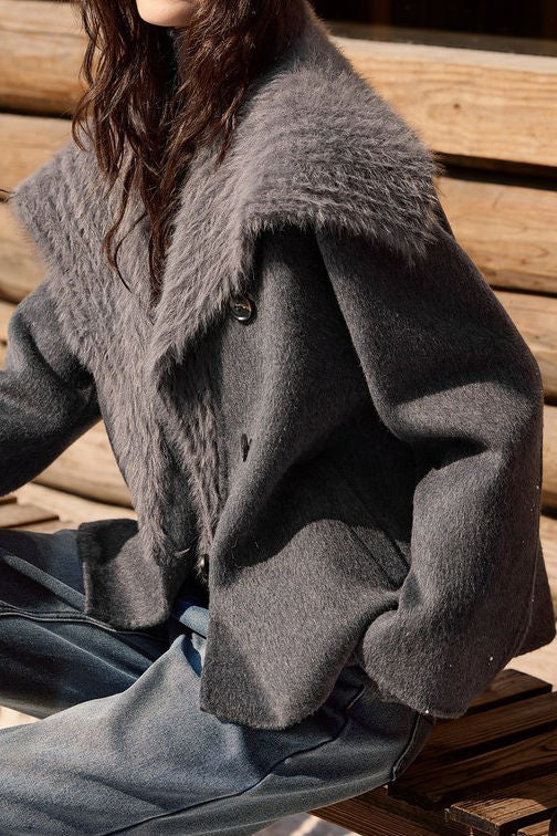 Jacket with a collar featuring a detachable fur collar that can be styled as a shawl or stand-up collar, front adorned with two decorative buttons and one functional button