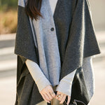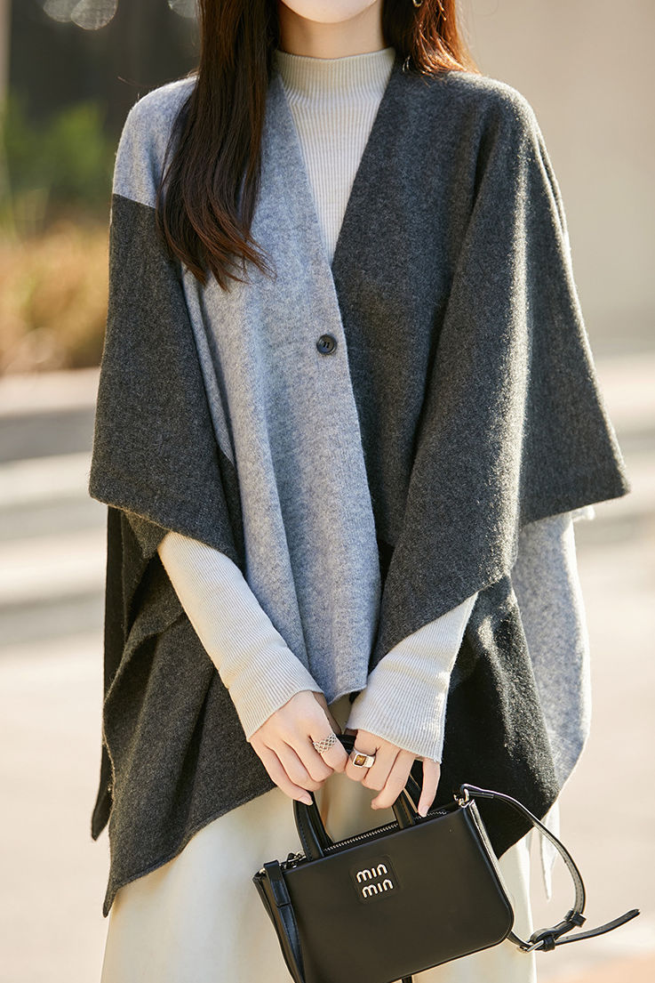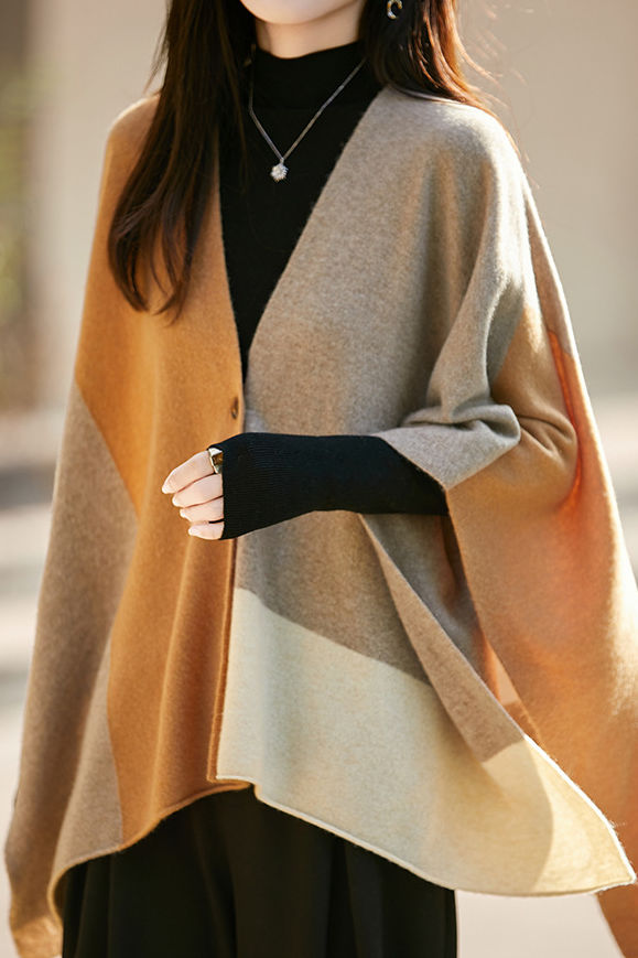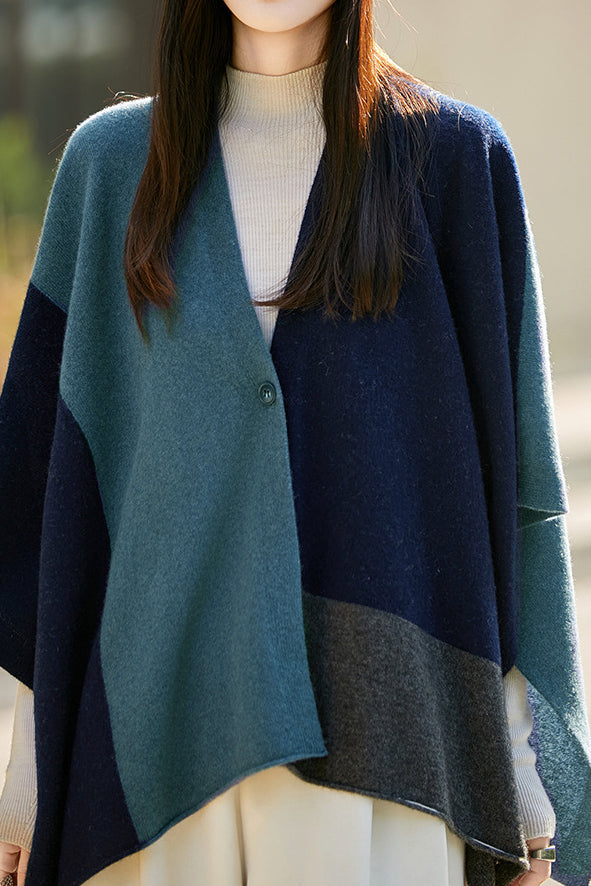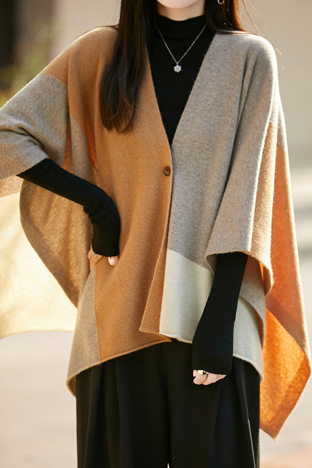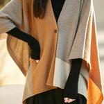 Shawl, open-front loose fit, full-body multi-color block design, with one openable button |