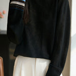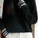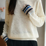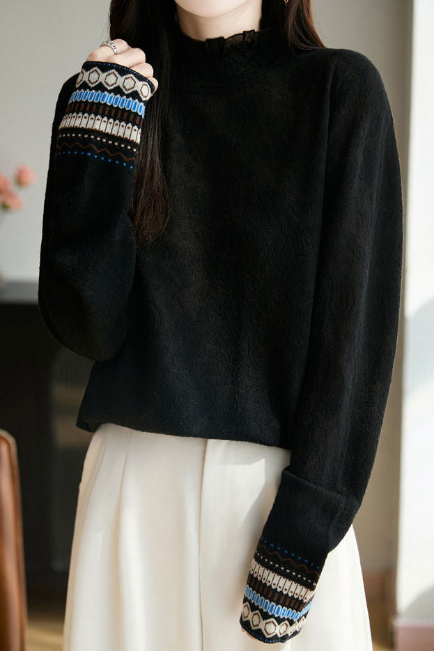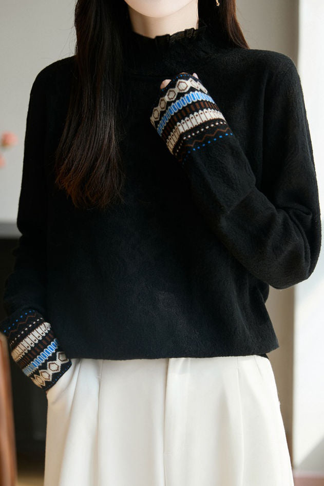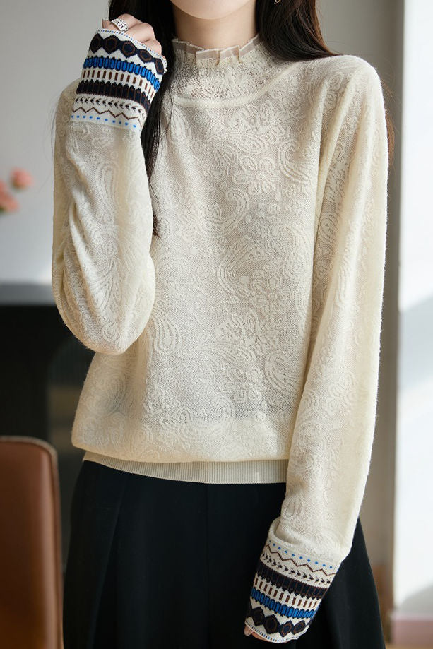 Knitted top, half-high neck design, neckline trimmed with gathered lace for softness, cuffs with patterned decorations for layering, soft and delicate knitted fabric