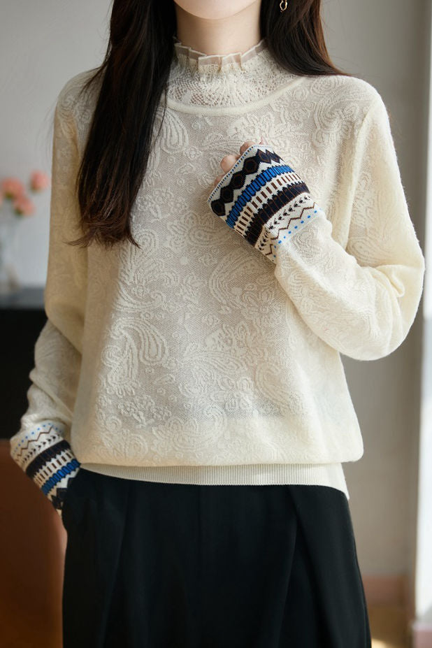 Casual Gentle Lace Patchwork Half-High Neck Jacquard Knitted Top