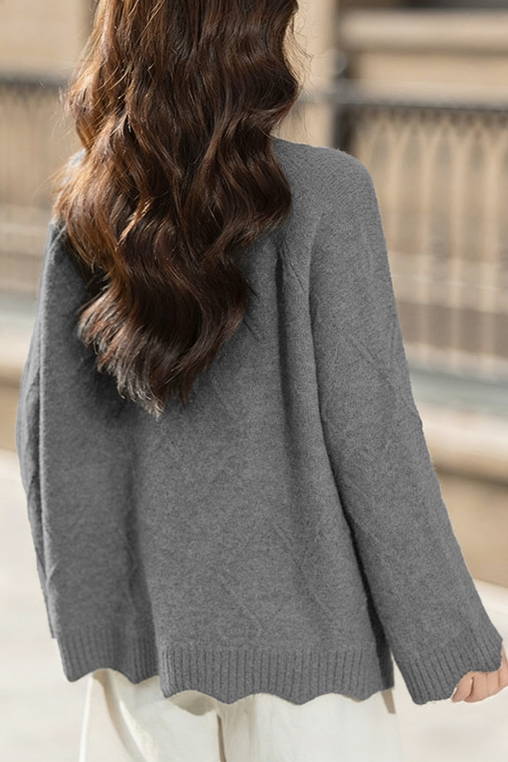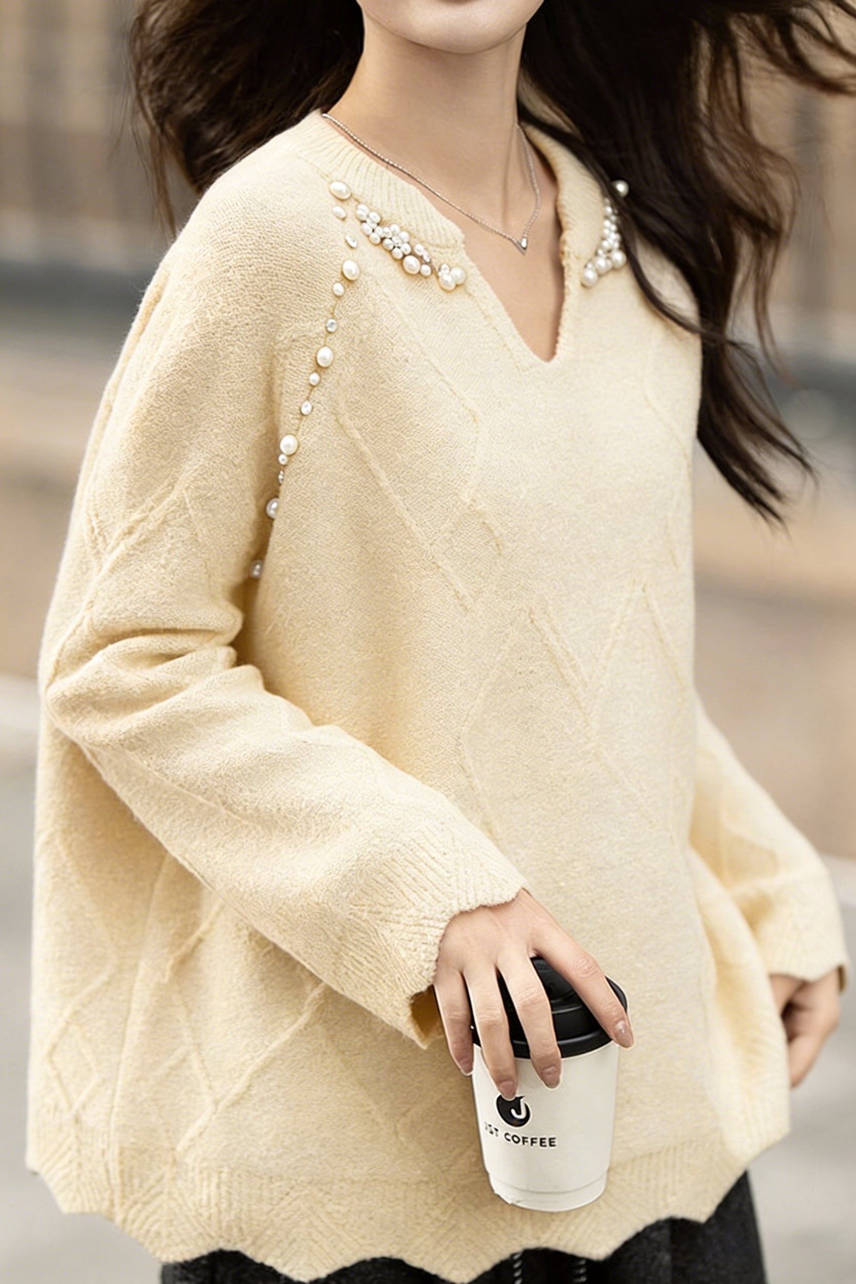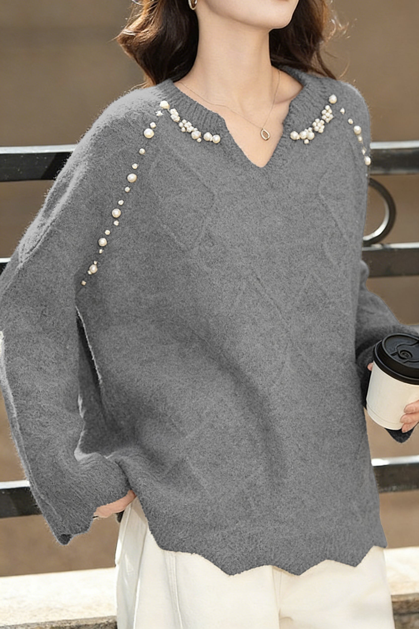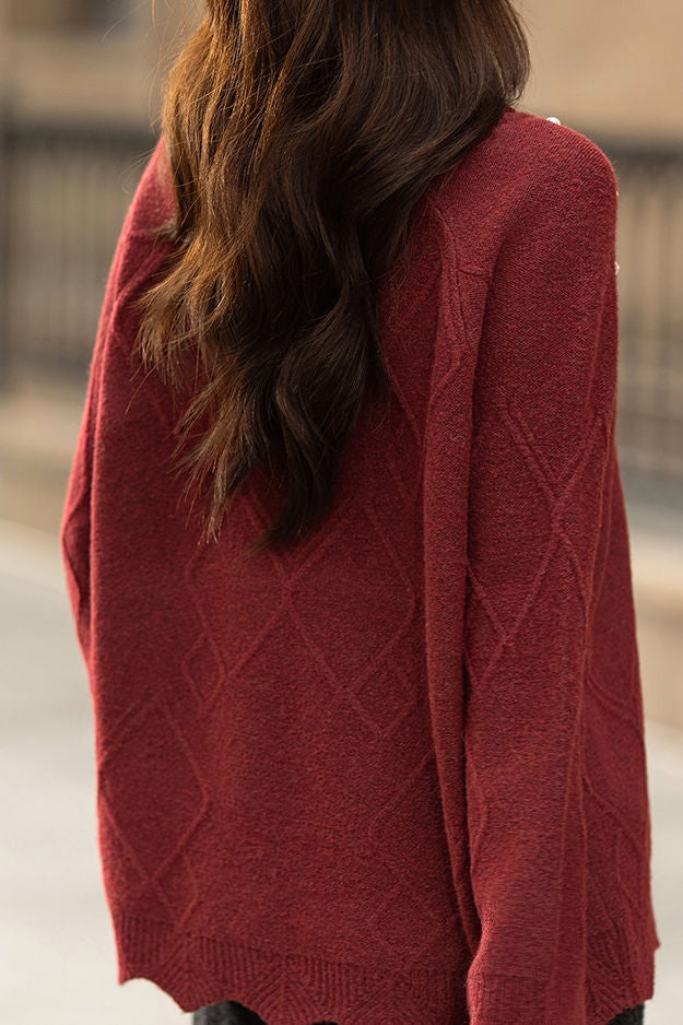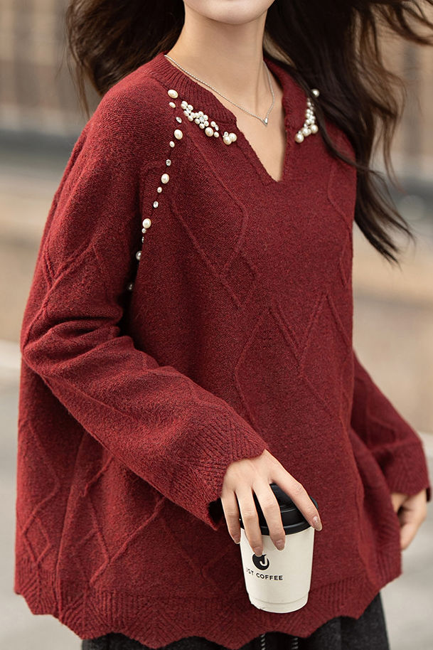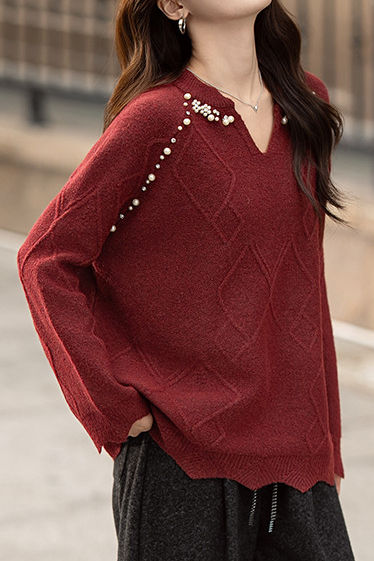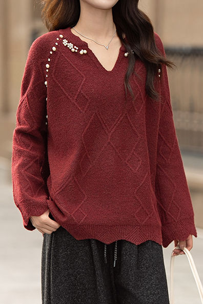 Pullover knitted top, v-neck long-sleeve loose fit, solid color, raglan sleeves, neckline to shoulders decorated with pearl and diamond beading, body with argyle texture, hem and cuffs with wave edge design