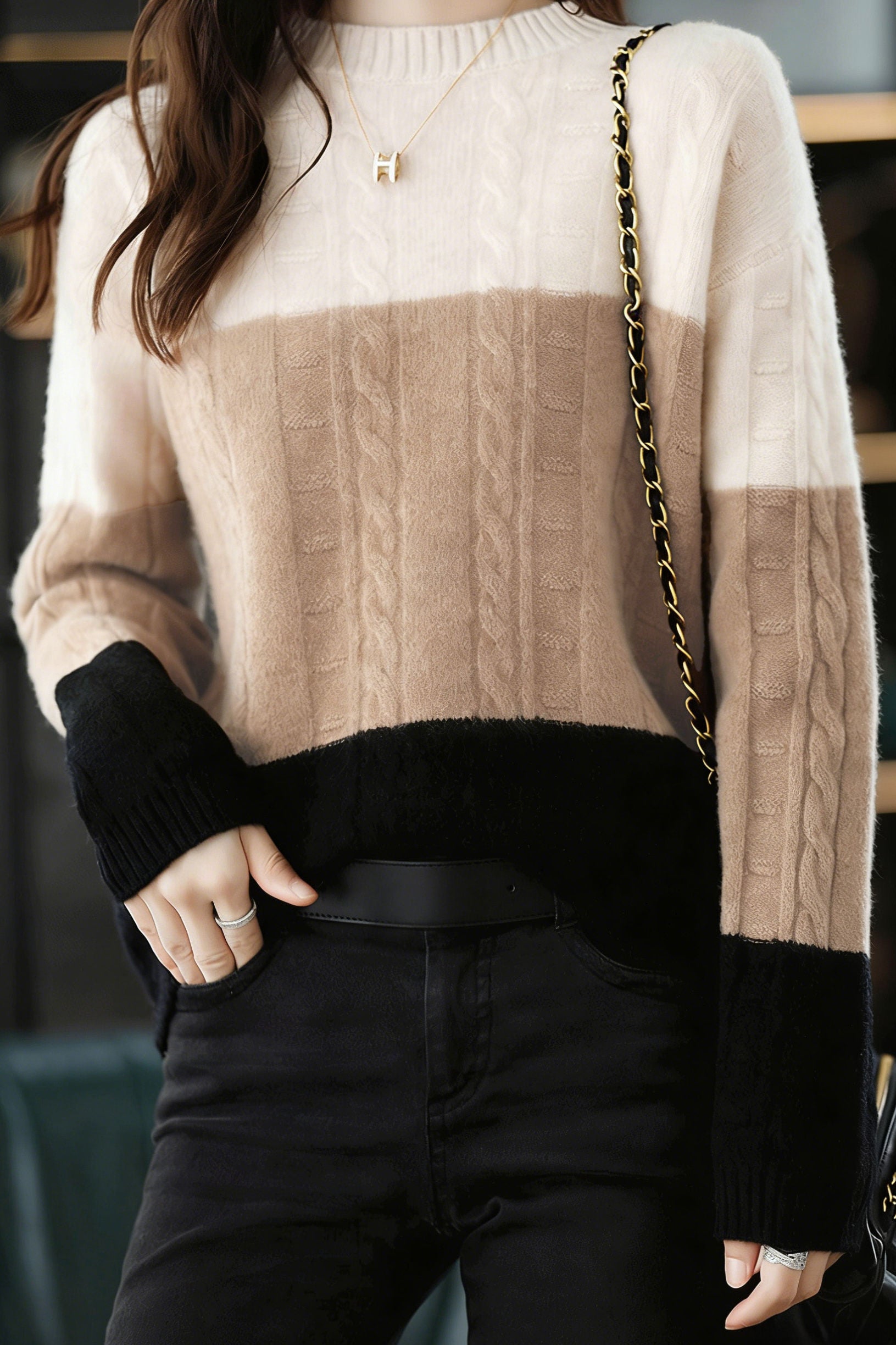 Knitted top, crew neck design, body with color-block splicing for layering, featuring cable-knit texture |