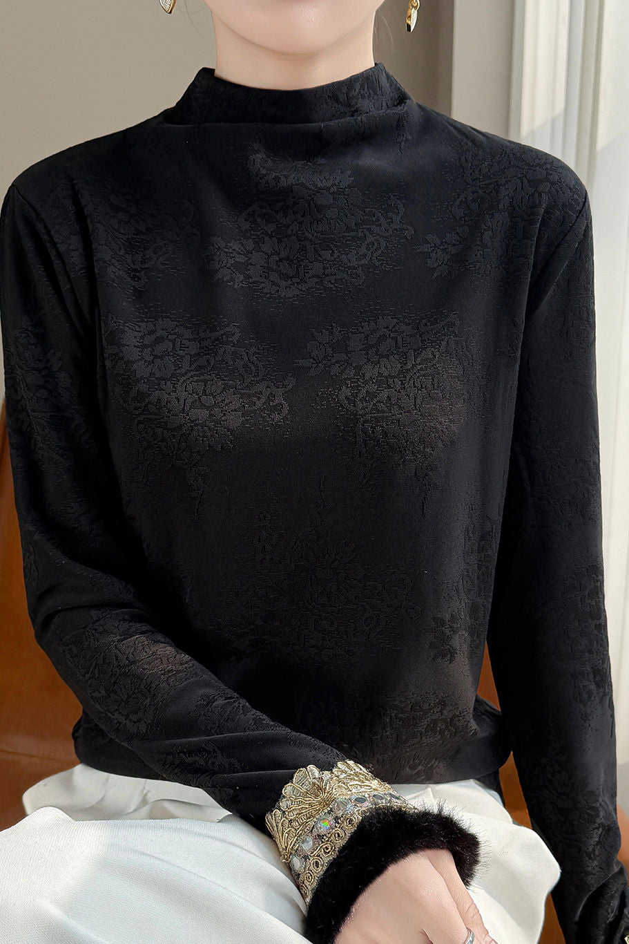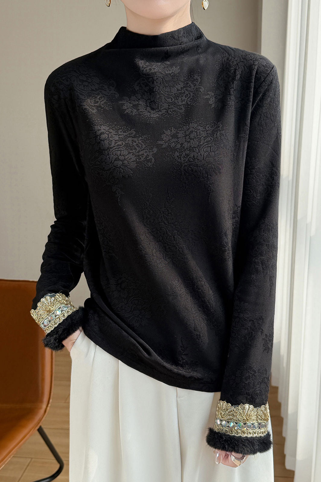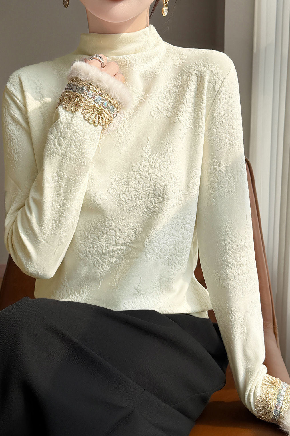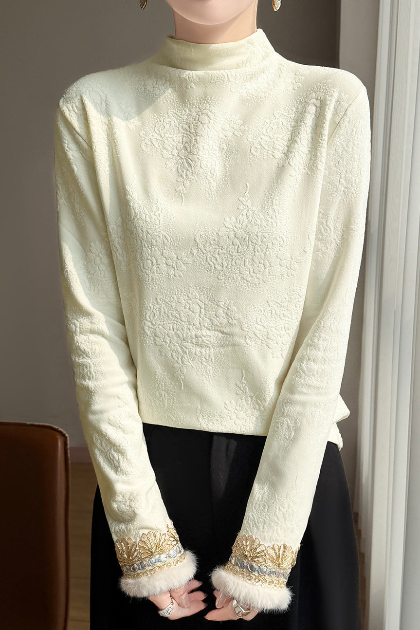 Knitted top, half-high neck design, body decorated with 3D embroidered ornaments for refinement, fabric with jacquard texture for enhanced quality