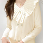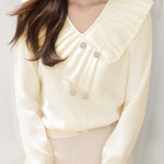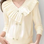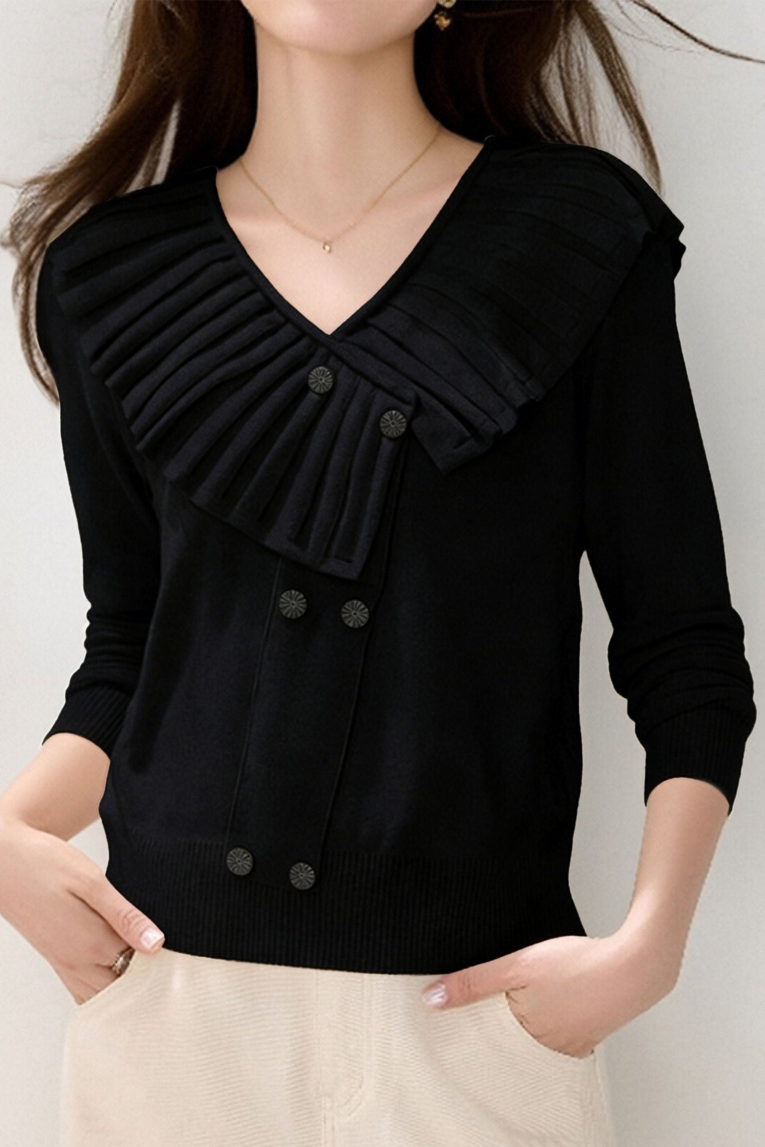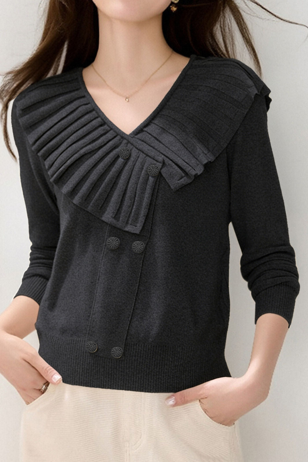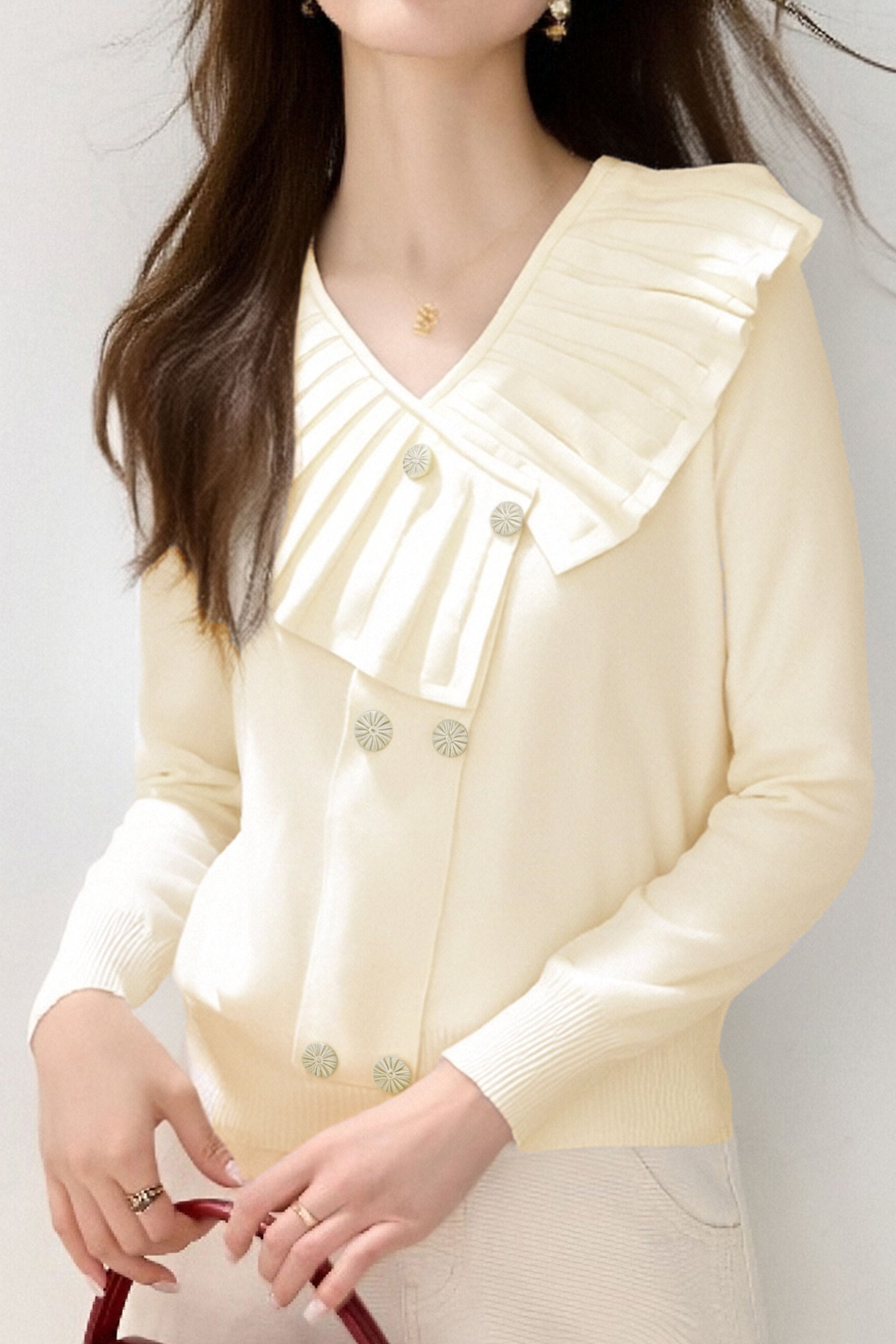 Knitted top, v-neck long-sleeve loose fit, front center with three pairs of non-openable decorative double buttons, front panel with ruffled lace |