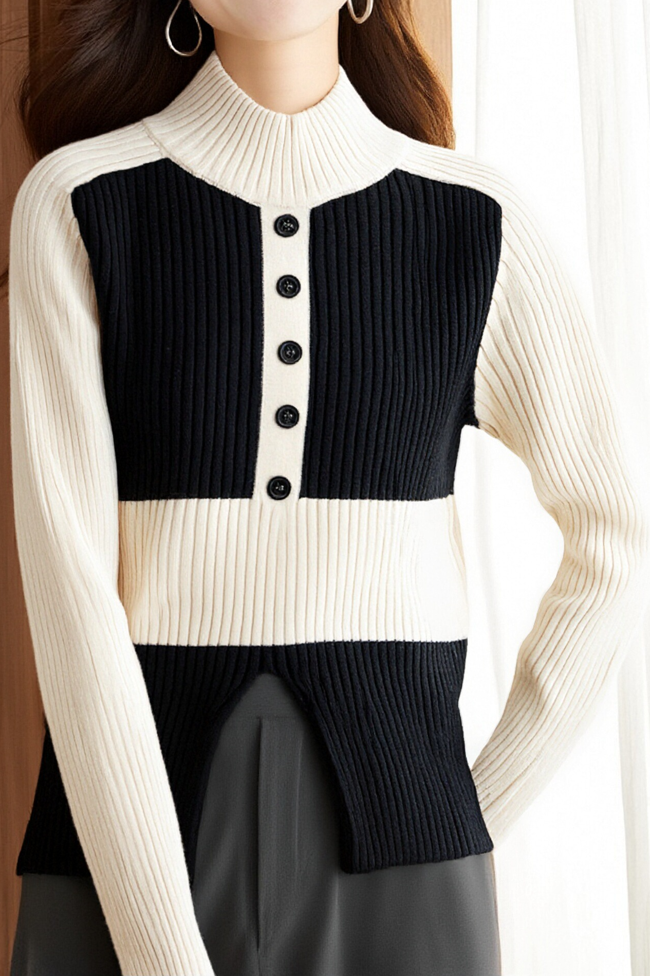 Casual Versatile Black-White Color-Block Slit Turtleneck Sweater