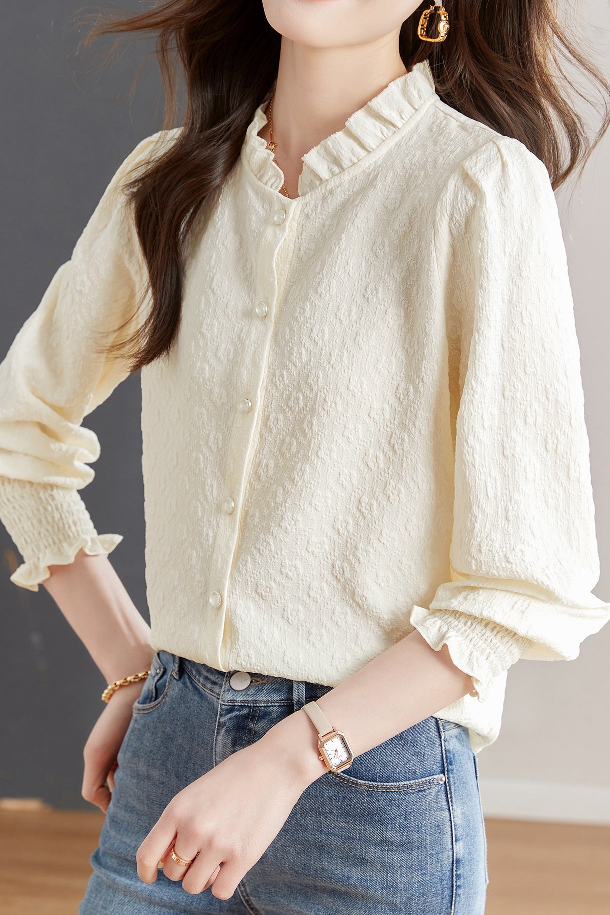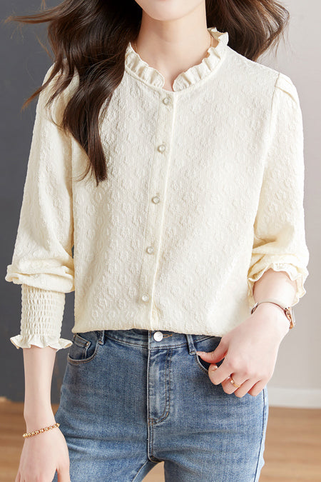 Casual Versatile Floral Jacquard Ruffled Crew Neck Blouse