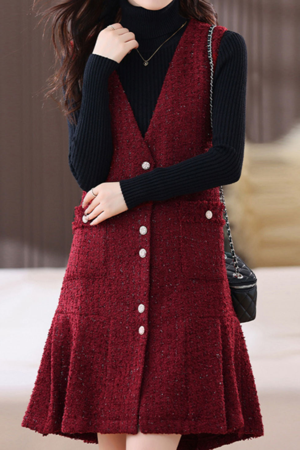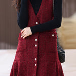 Waistcoat Dress with deep V-neck and sleeveless design, featuring decorative metal buttons on the placket and practical side pockets