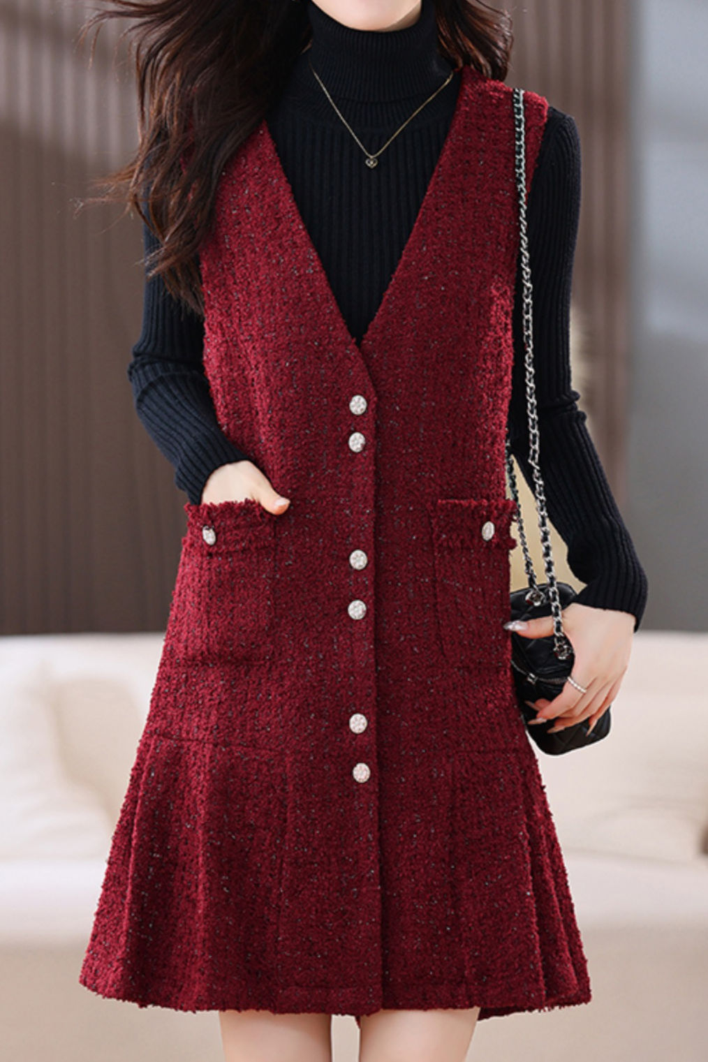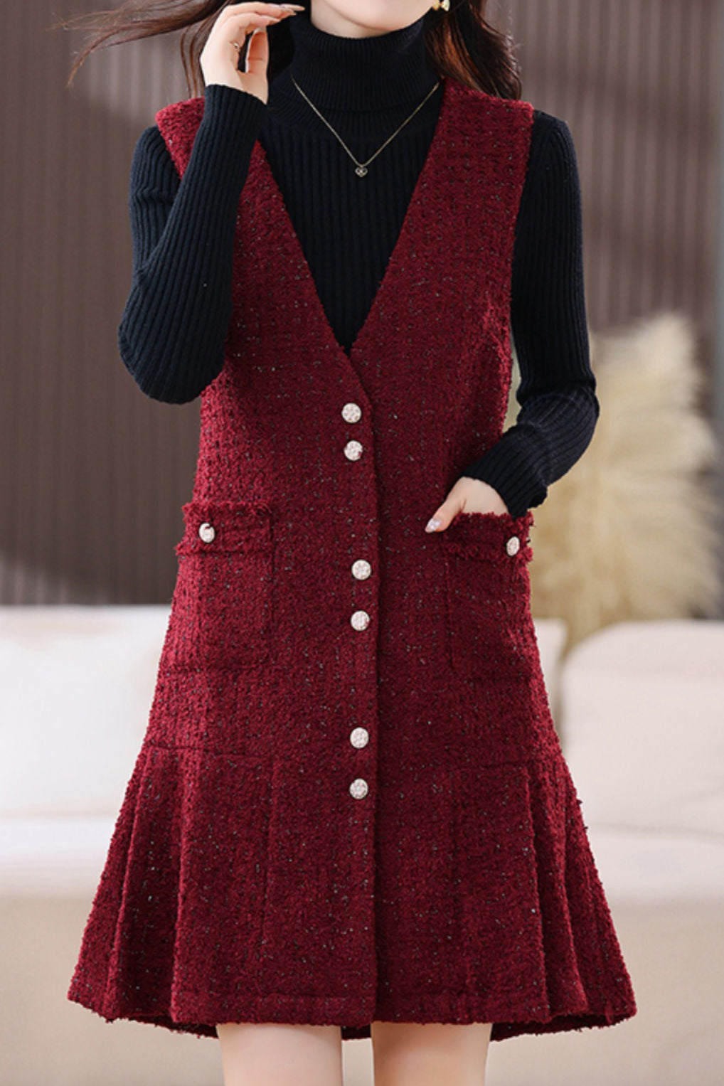 Casual Faux Layered Dress with Pleated Collar and Pearl Tie