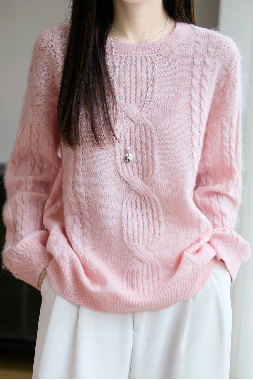 Casual Versatile Solid-Color Crew Neck Pullover Cable-Knit Sweater